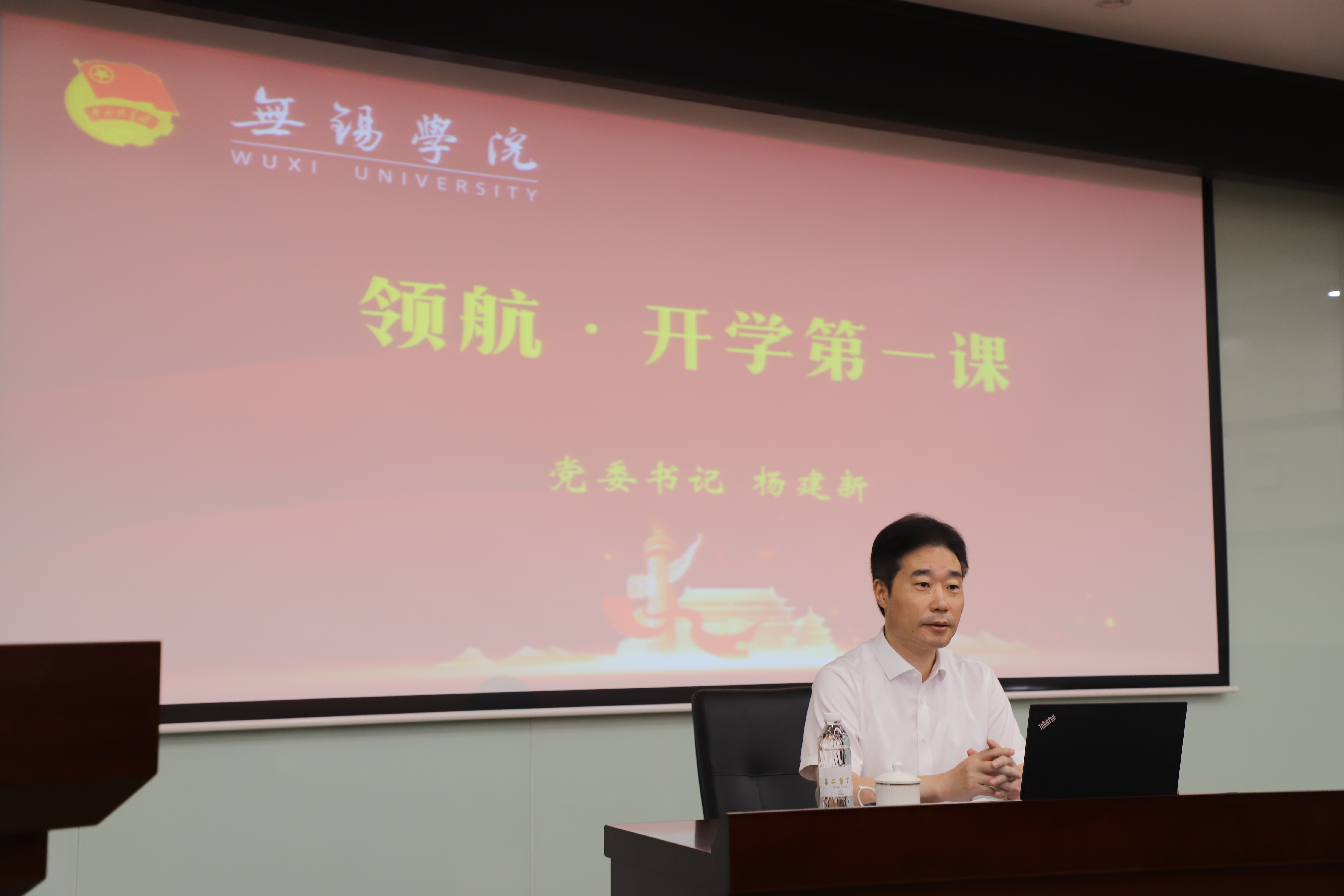 校党委书记杨建新以“不负时代,不负韶华,用奋斗书写青春华章”为题为新同学讲授“开学第一课”。他首先带领同学们学习了中国共产党伟大的建党精神,激励新同学不负时代,不负韶华,努力成为担当民族复兴大任的时代新人。他结合习近平总书记“七一”重要讲话的精神与要求,带领新同学们深入学习了中国共产党伟大的建党精神,向大家分享了三方面的内容:大力传承和弘扬伟大建党精神,高举马克思主义理想之光;大力传承和弘扬伟大建党精神,坚定不移走中国特色社会主义道路;大力传承和弘扬伟大建党精神,与祖国、与人民同呼吸共命运。杨建新向新同学介绍学校是一所有特色、有朝气的大学,经过全校师生的共同努力,如今已形成了多学科、多元化、体制健全的办学体系,人才培养、服务地方能力不断提升。他鼓励新生要传承“艰苦朴素、勤奋好学、追求真理、自强不息”的校风,坚持守正创新、团结协作、锐意进取。他向新同学寄予三点希望:一是把握时代变革担当新作为,希望同学们把自己的理想同祖国的前途、把自己的人生同民族的命运紧密联系在一起,在奋斗奉献、服务祖国发展中实现自我价值,担当时代责任;二是锤炼品德修为弘扬真善美,希望同学们要把正确的道德认知、自觉的道德养成、积极的道德实践紧密结合起来,打牢道德根基,弘扬传统美德,做到关爱自己、关爱他人、志向高洁、与人为善,并时刻保持发现美、赞扬美、塑造美的精神;三是坚持知行合一增长真才干,希望同学们能够规划经营好自己的大学生涯,在日常实践中学好专业知识,充分利用学校提供的优质资源,积极投身学科竞赛和创新创业活动,全方位提升自我,为实现中华民族伟大复兴的中国梦贡献青春力量!