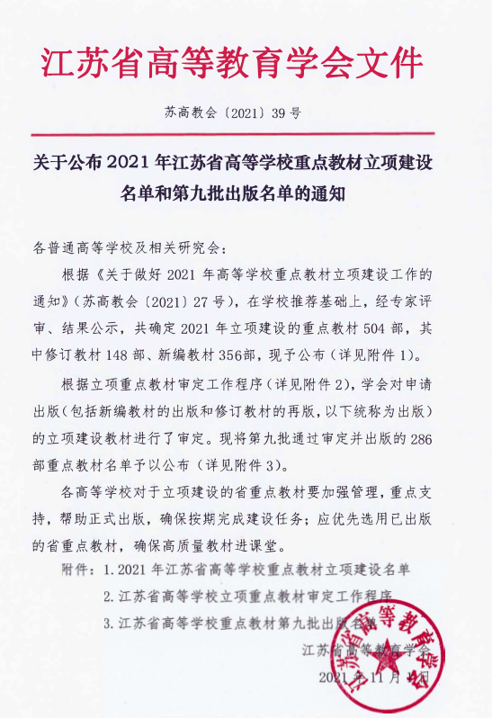 近日,江苏省高等教育学会公布了2021年江苏省高等学校重点教材立项建设名单和第九批出版名单。我校限额申报4部,其中3部教材获批立项,获批数量创学校历史新高。