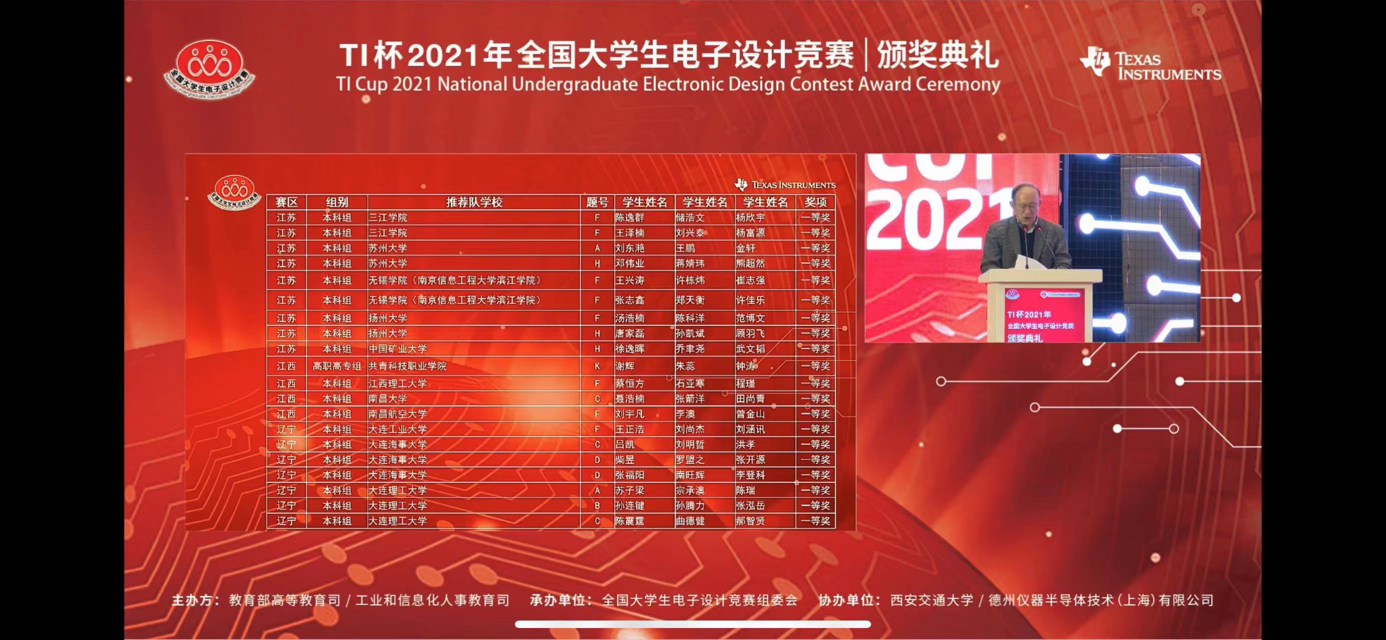 近日,2021年全国大学生电子设计竞赛正式落下帷幕。我校电子信息工程学院共组织9支队伍参赛,最终获得全国一等奖2项,全国二等奖2项,省一等奖2项,省二等奖3项,获奖率100%,全国奖获奖率达44%,居全国参赛高校前列。获全国奖数量位于江苏省高校第5位,仅次于南京邮电大学、南京信息工程大学、东南大学、江苏大学,取得历史最好成绩。