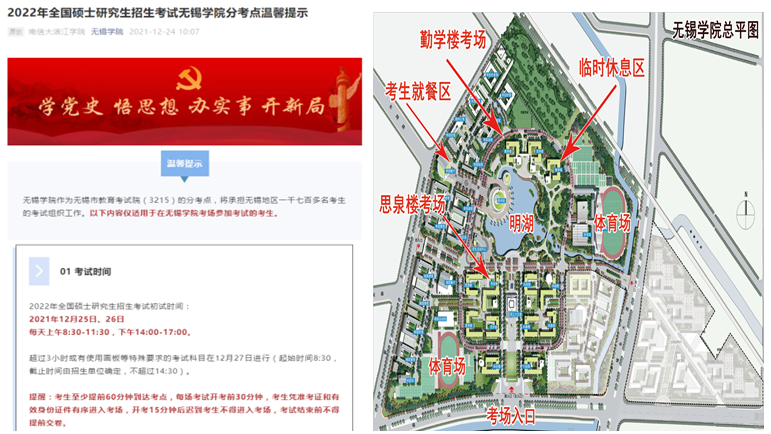 为细致周到服务广大考生,学校通过网站通知、微信公众号推送等方式,发布了《2022年全国硕士研究生招生考试无锡学院(南京信息工程大学滨江学院)应试考生须知》《2022年全国硕士研究生招生考试无锡学院(南京信息工程大学滨江学院)分考点温馨提示》等通知,就考场安排、赴考路线、入校流程、防疫要求、午休午餐等事项对考生进行温馨提示,并耐心细致回复考生电话咨询,设置路标、安排专人在考生专用通道沿途值守指引。