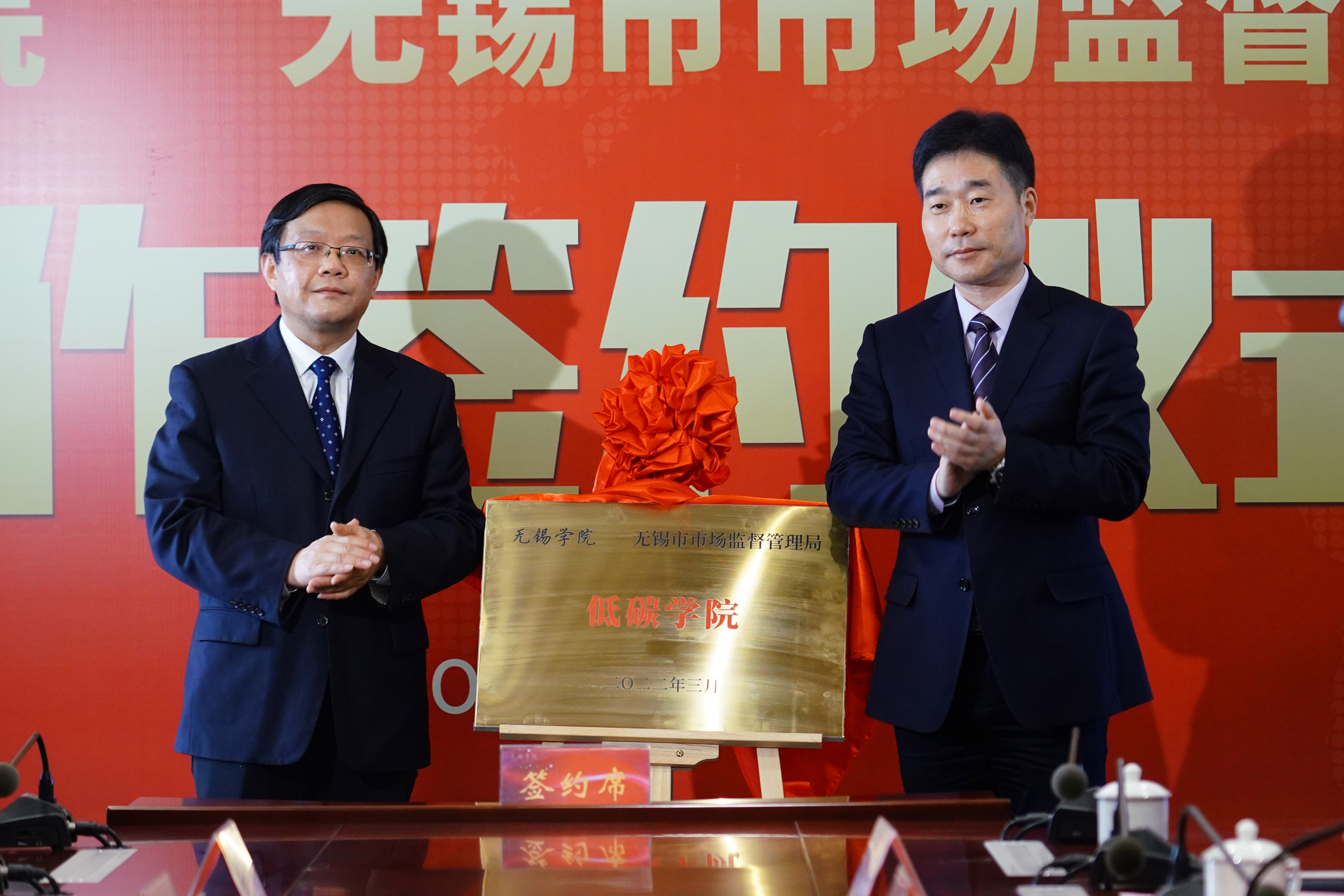 3月9日,我校与无锡市市场监督管理局举行战略合作签约仪式,并为双方共建的“低碳学院”和“检学研合作基地”揭牌。无锡市人民政府副秘书长周浩明,无锡市市场监督管理局党组书记、局长周建辉及领导班子成员,校党委书记杨建新、校长张永宏及校领导班子成员出席活动。