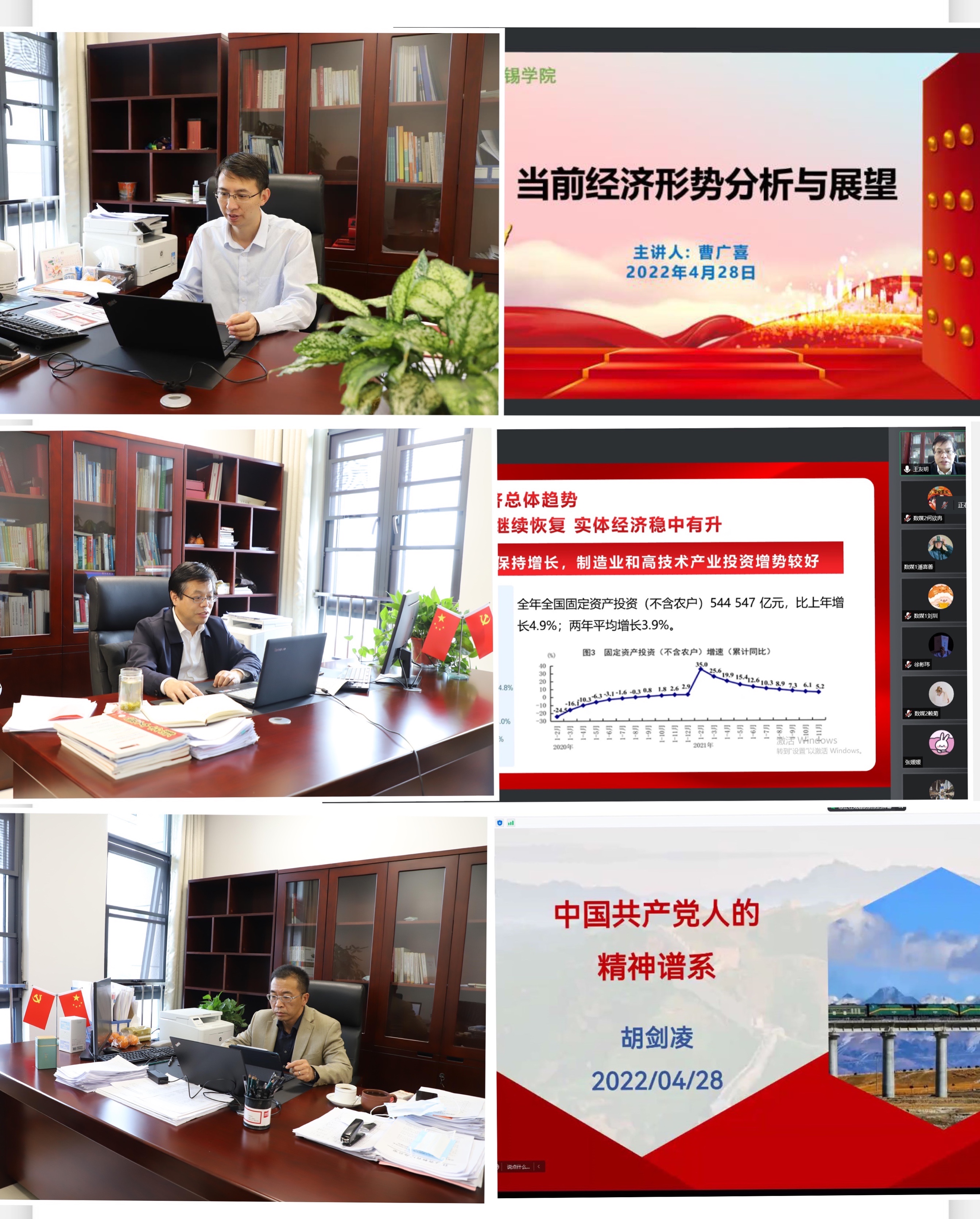 4月26日至5月4日,由于当前疫情防控原因,校党委书记杨建新教授、校长张永宏教授和其他校领导通过线上授课的方式,为同学们带来了一系列内容丰富、视野开阔、理论深刻、极具吸引力的《形势与政策》课。校党委书记杨建新教授围绕“百年奋斗谋复兴——深入学习党的十九届六中全会”这一主题,着重阐述了党的十九届六中全会精神的核心要义和第三个历史性决议的内涵,分析和总结了党的百年历程重大成就和历史经验,并勉励青年学生要大力弘扬伟大建党精神,勿忘昨天的苦难辉煌,无愧今天的使命担当,不负明天的伟大梦想,争做有理想、有本领、有担当的时代青年。校长张永宏教授以“坚持多边主义、完善全球治理”为主题,着重分析当今世界复杂多变的国际环境、前所未有的全球治理困局以及中国积极践行多边主义的负责任大国形象,引领学生在深刻了解和把握国际复杂形势中增强“四个自信”,并为青年学生奉上五四青年节的特别问候,勉励学生学习真知识、掌握真本领,乘新时代春风,放飞青春梦想。校党委副书记匡辉、副校长梁惠娥、副校长曹广喜、纪委书记王友明以及副校长胡剑凌,分别围绕党的重大精神、冬奥盛会、经济形势、中国共产党人的精神谱系等重大热点问题,多学科、多层次、多角度引领学生要认清时代大势、坚定崇高理想信念,树牢忠诚笃信之志,以实际行动为实现中华民族伟大复兴作出积极贡献。