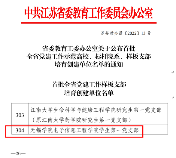 近日,江苏省委教育工委公布了首批培育建设的全省党建工作样板支部名单,我校电子信息工程学院学生第一党支部入选首批全省“党建工作样板支部”培育创建单位。