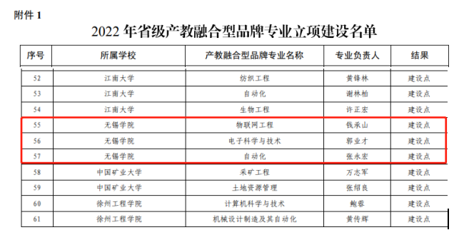 近日,江苏省教育厅正式公布了2022年省级产教融合型品牌专业评审结果,我校物联网工程、电子科学与技术、自动化3个申报专业全部入选建设点,入选数量位居江苏省本科高校第六,同类高校第一。