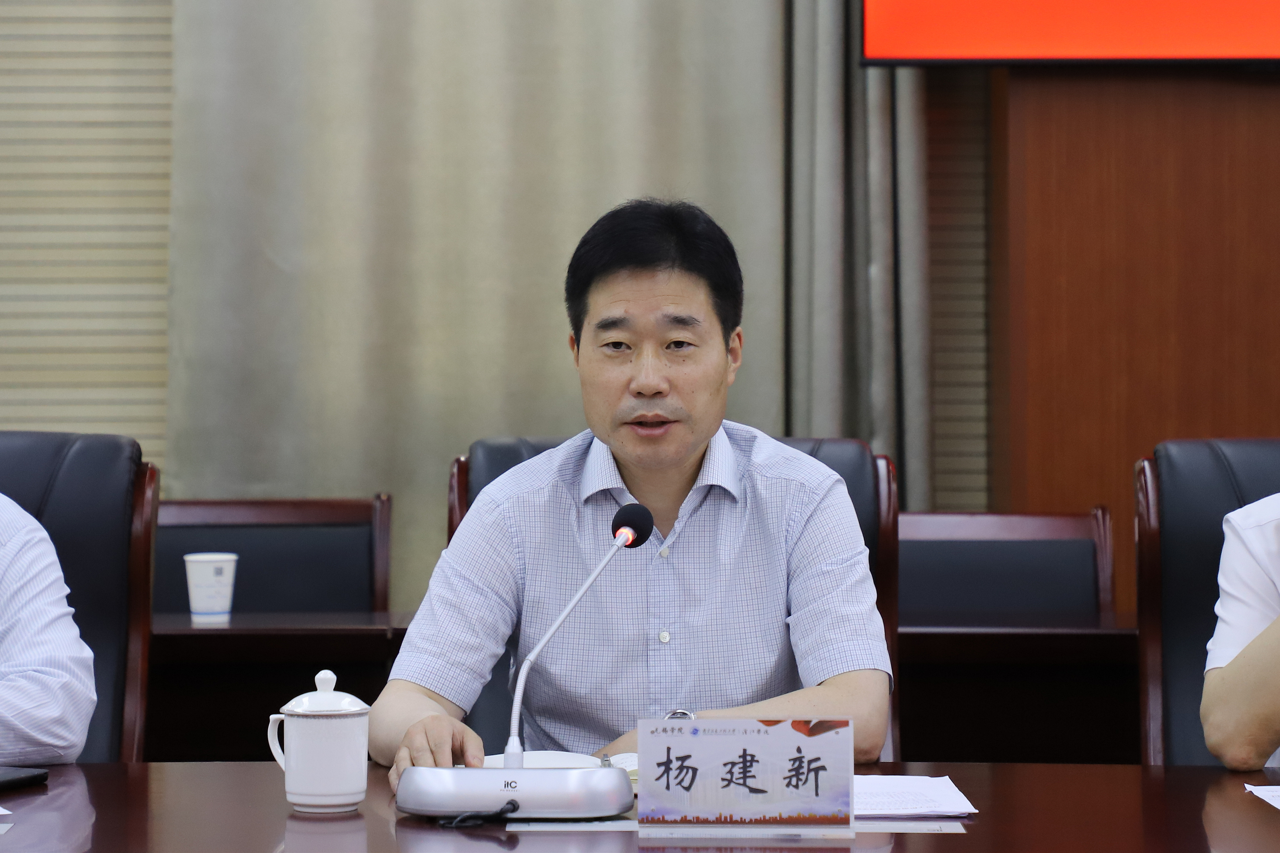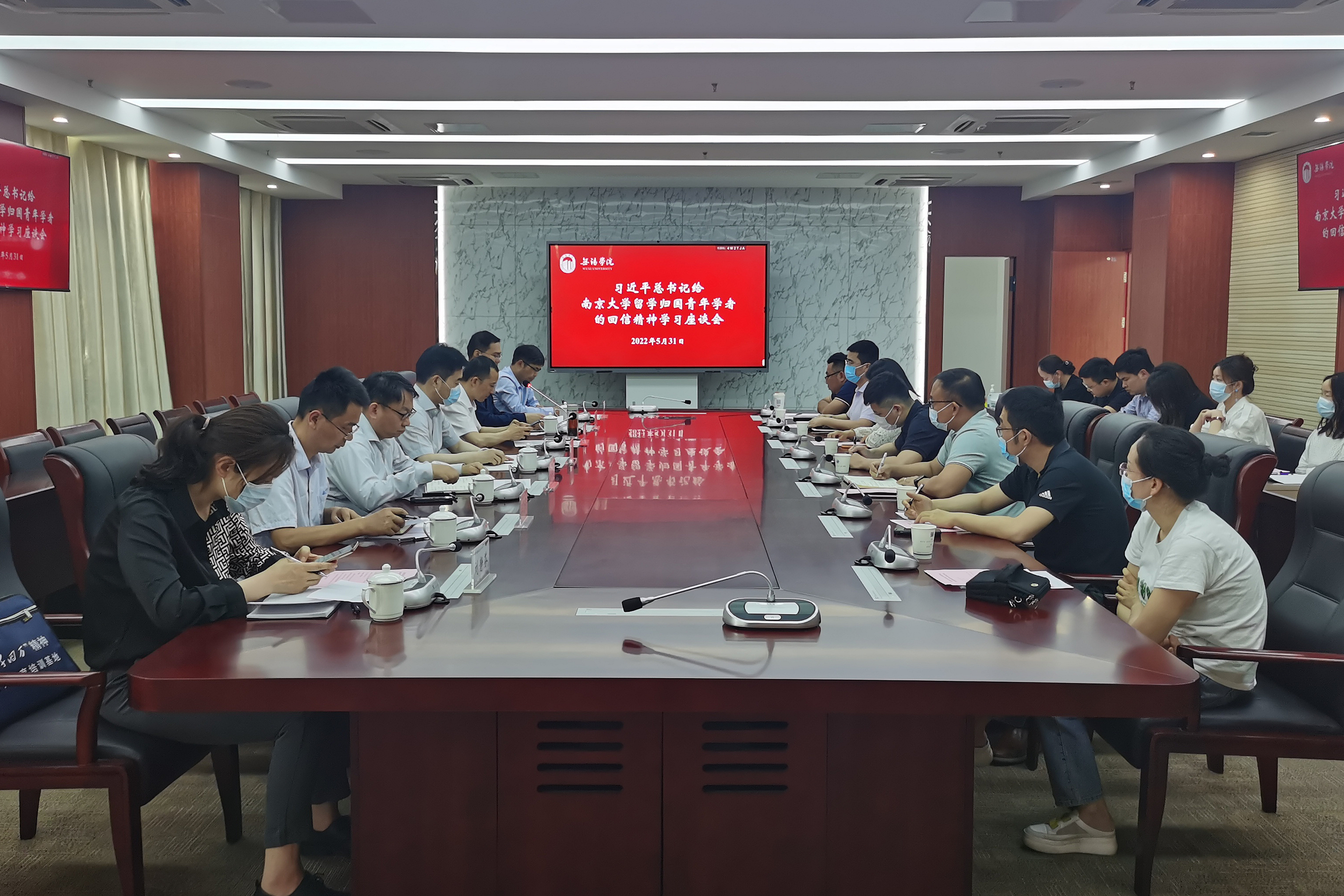 5月31日下午,学校举行习近平总书记给南京大学留学归国青年学者的回信精神学习座谈会,校党委书记杨建新、党委副书记匡辉、无锡市侨联副主席余海光、党委统战部、党委教师工作部和国际交流合作处负责同志、留学归国人员代表参加座谈会,会议由校党委副书记匡辉主持。