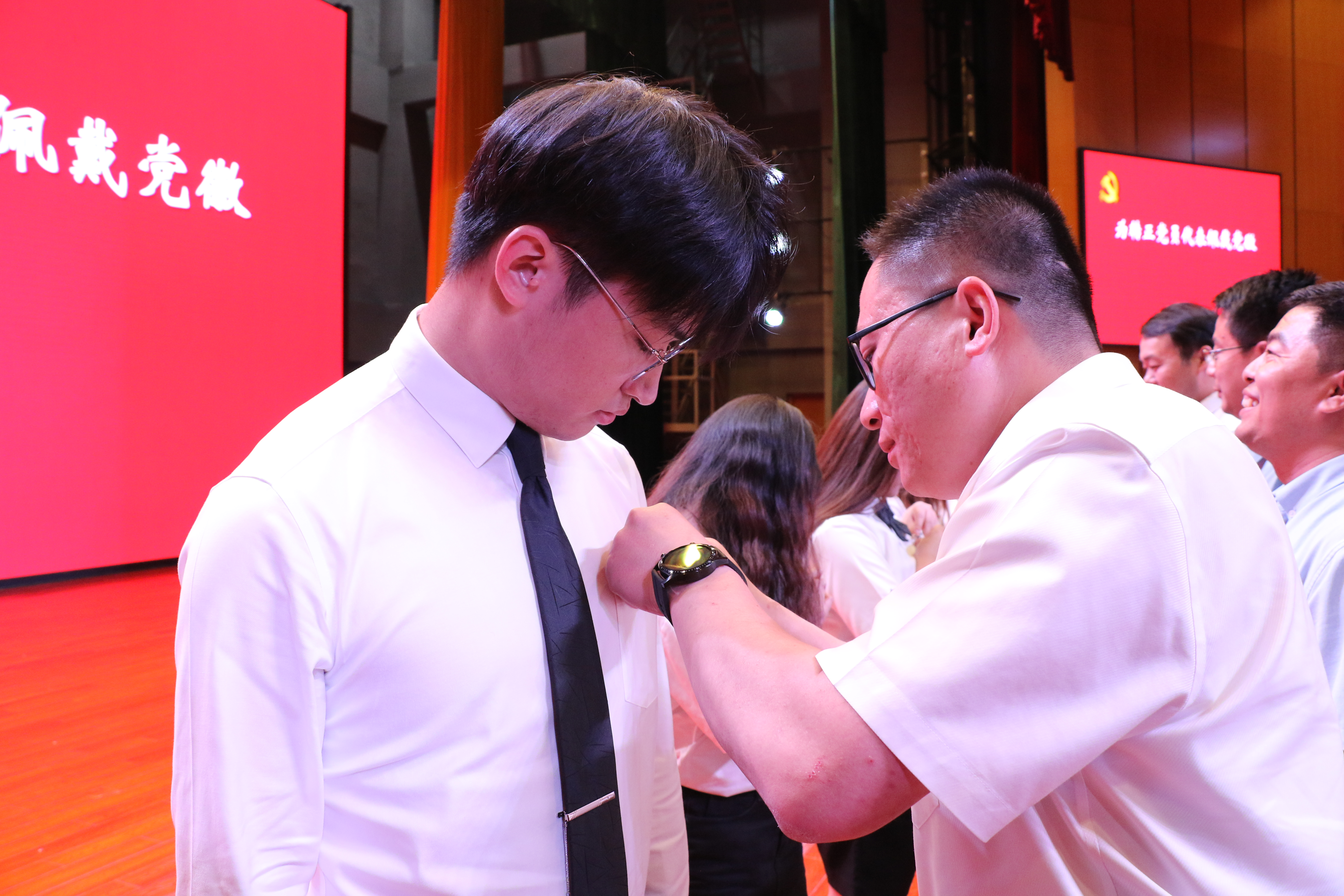 活动中,匡辉为毕业生党员送上了一份专属的“政治生日卡”,党委组织部、学工处、团委负责人和各二级学院党总支负责人为刚刚转正的预备党员代表佩戴党员徽章,党委书记杨建新以入党30年老党员身份带领全体党员重温入党誓词。