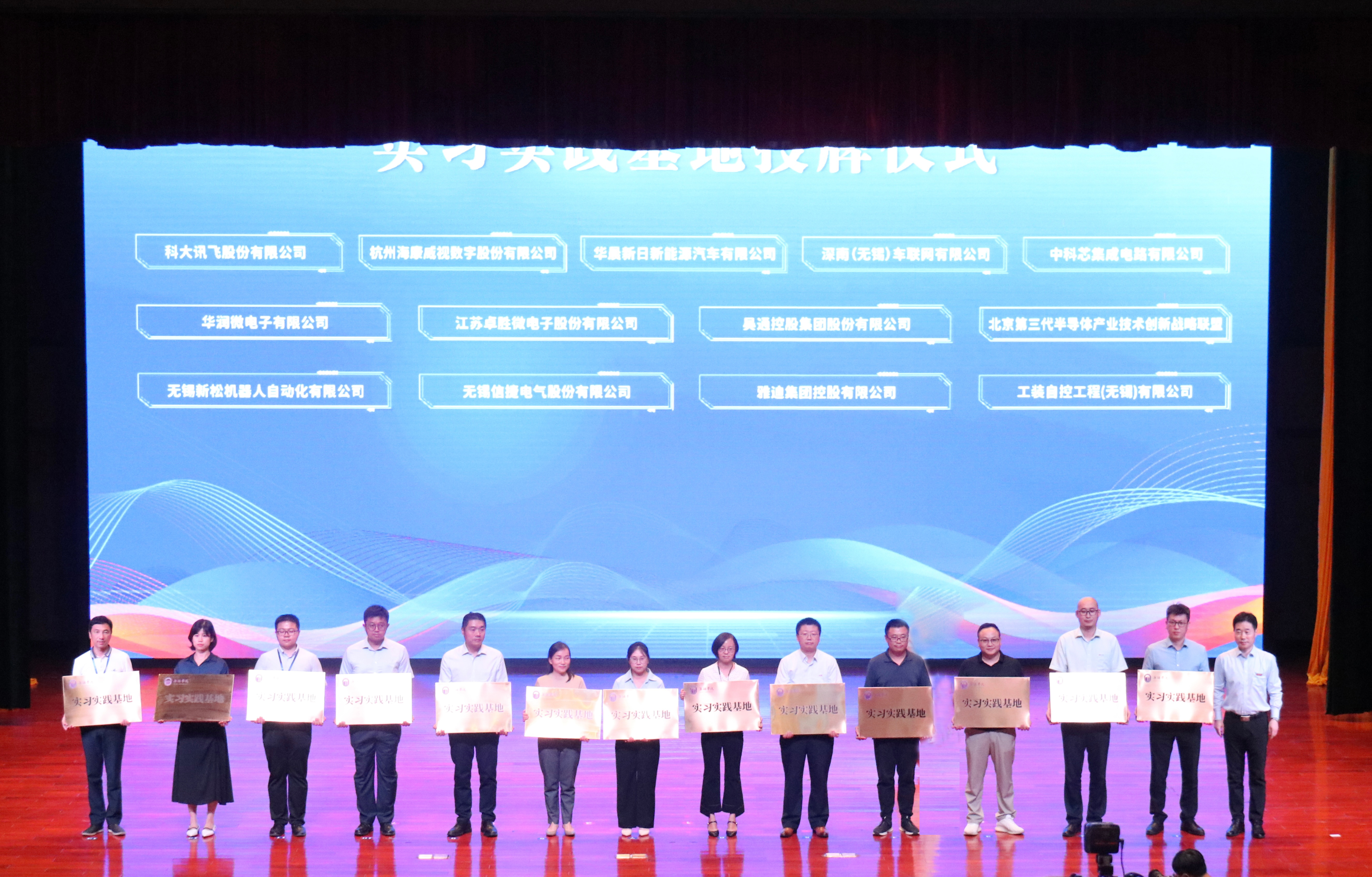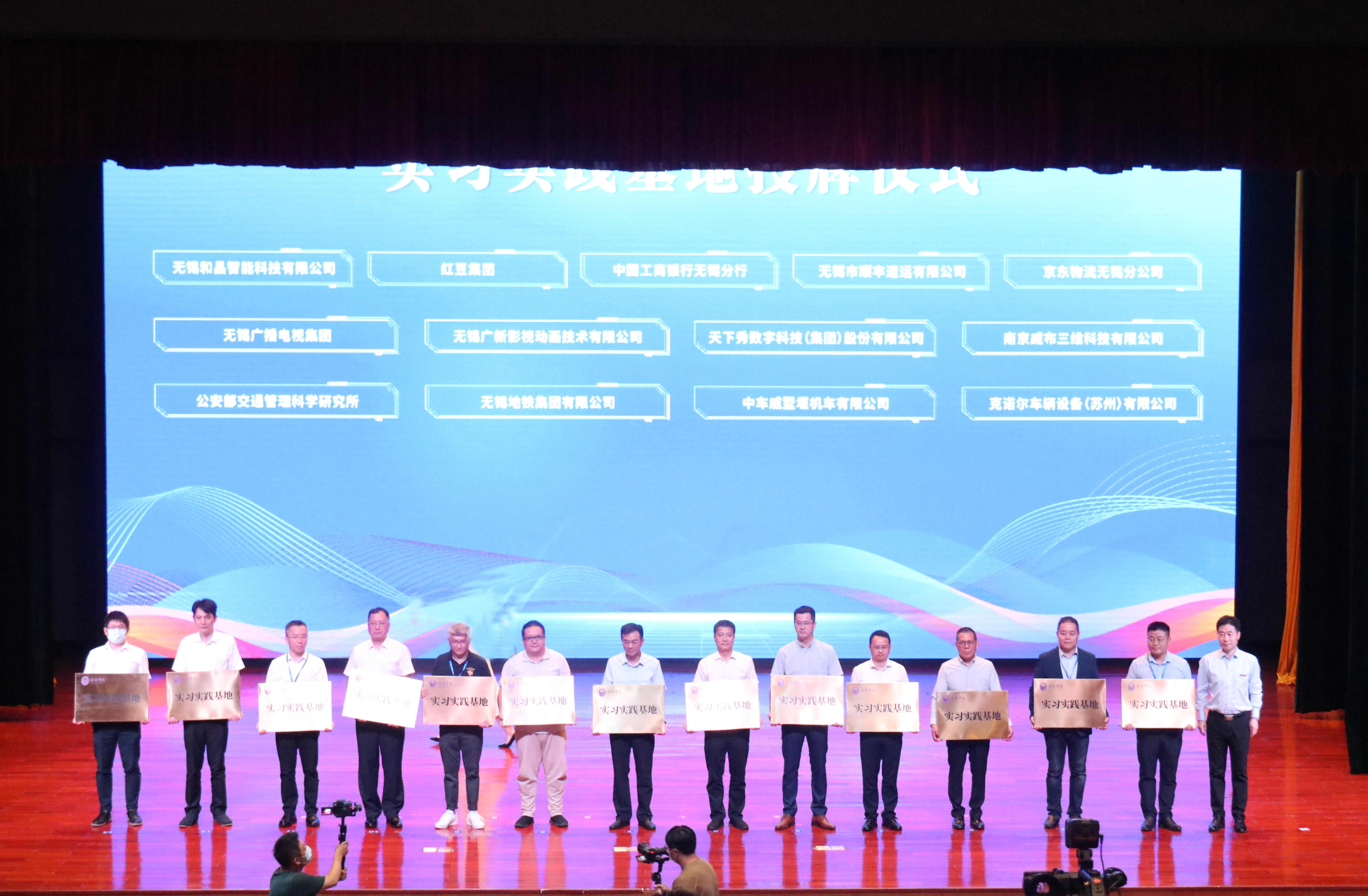开幕式上,我校携手中兴通讯股份有限公司、京东集团、红豆集团、中科芯集成电路有限公司、无锡新松机器人自动化有限公司、华晨新日新能源汽车有限公司、无锡广播电视集团、公安部交通管理科学研究所、无锡地铁集团等28家头部企事业单位建设现代产业学院。校领导张永宏、匡辉、梁惠娥、王友明、胡剑凌依次为车联网产业学院、集成电路产业学院、智能制造产业学院、数字经济产业学院、数字文创产业学院和城市轨道交通产业学院揭牌。学校还与上述企业共建大学生实习实践基地,党委书记杨建新为企业代表授牌。