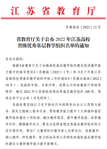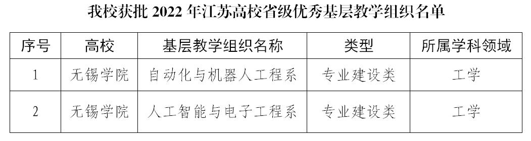近日,《省教育厅关于公布2022年江苏高校省级优秀基层教学组织名单的通知》发布,确定2022年江苏高校省级优秀基层教学组织100项。我校2个基层教学组织“自动化与机器人工程系”“人工智能与电子工程系”在本次评选中脱颖而出成功获批,获批数量位列省内同类本科高校第一。