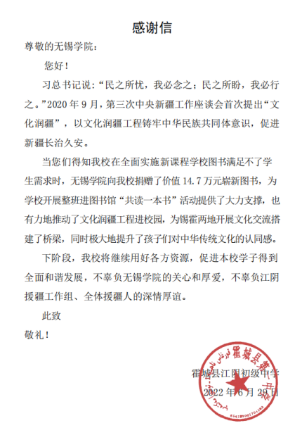 9月22日,我校收到新疆伊犁哈萨克自治州霍城县江阴中学发来的感谢信,信中高度赞扬了我校开展的图书捐赠和对口援疆工作。感谢信中提到,本次图书捐赠活动,为霍城县江阴中学开展整班进图书馆“共读一本书”提供了大力支撑,有力地推动了文化润疆工程进校园,为锡霍两地开展文化交流搭建了桥梁,同时提升了青少年对中华传统文化的认同感。