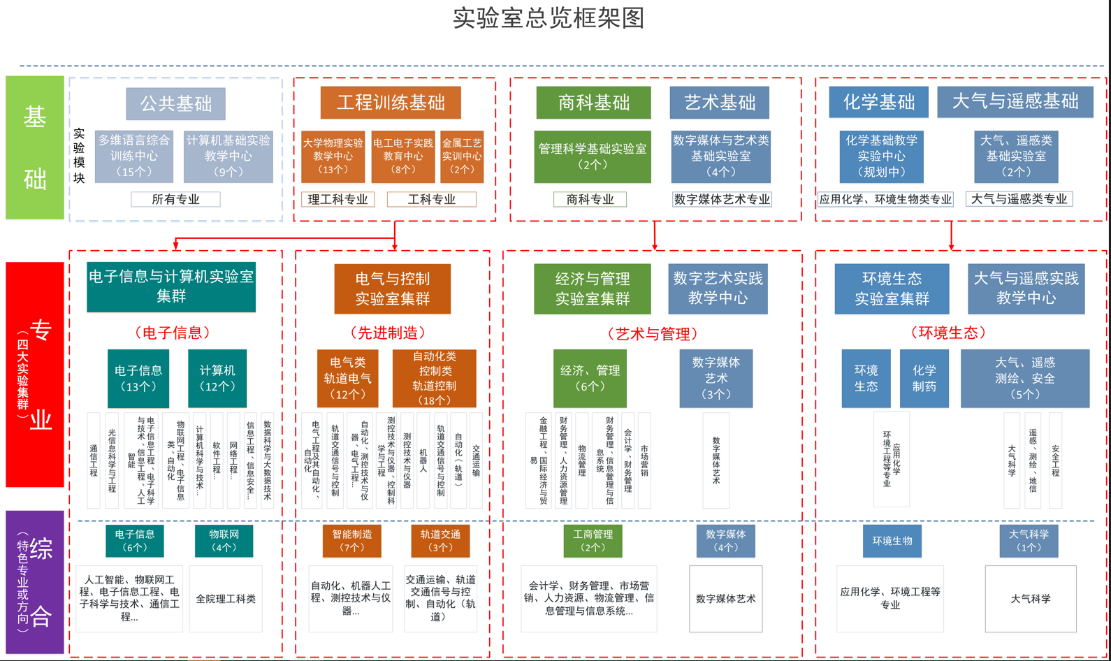 至目前,全校经总体规划、顶层设计、专家论证、集中建设已建成131个实验室,初步形成了电子信息、先进制造、环境生态、艺术与管理等实验集群,占地面积13000平方米,总投入约1.3个亿。