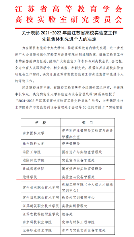 省高等教育学会《关于表彰2021-2022年度江苏省高校实验室工作先进集体和先进个人的决定》