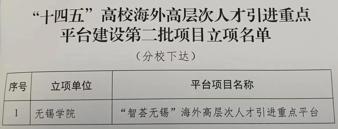 申报“智荟无锡”海外高层次人才引进重点平台并获批“十四五”高校海外高层次人才引进重点平台建设项目。“智荟无锡”海外高层次人才引进重点平台坚持“引进来”与“走出去”相结合,以全职引进为主,兼顾柔性引才,不唯国籍引进优秀人才,增加海外高层次人才引进的吸引力和针对性,扩大引进海外高水平专家、学者来锡任教、讲学和科研合作的规模,提高我校师资国际化水平,提升海外引进人才在我校学科建设、人才培养和科技创新发展中的效能,增强引才平台的可持续发展力。“‘智荟无锡’海外高层次人才引进重点平台”成功获批立项,标志着我校海外高层次人才引进工作迈入新阶段。