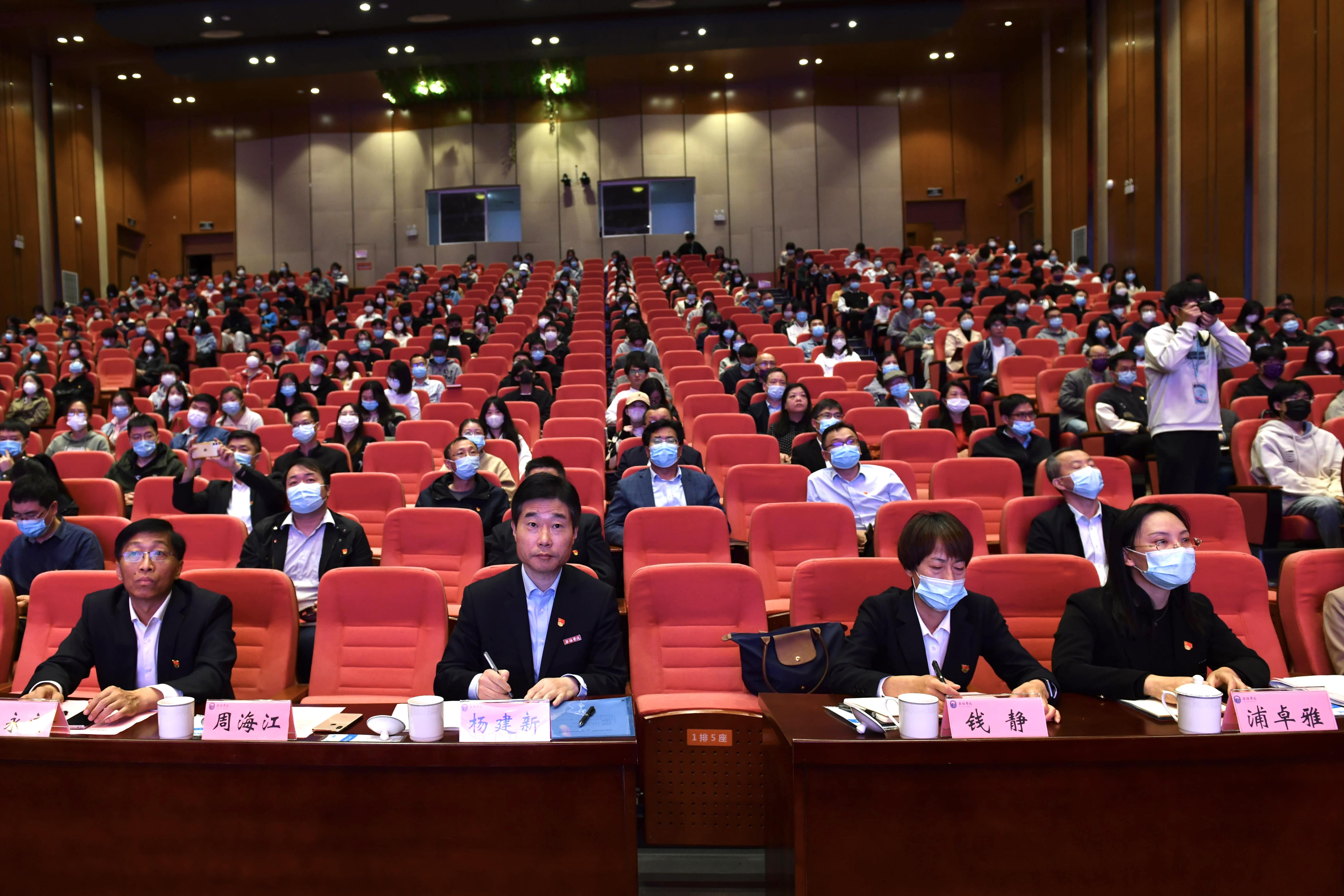 10月27日上午,我校在大礼堂报告厅举办“党的二十大代表进校园”活动,特邀党的二十大代表、红豆集团党委书记、董事局主席周海江来校作党的二十大精神学习报告,此次报告会是党的二十大胜利闭幕后,江苏省内党代表首次走进高校宣讲。全体校领导,各中层单位负责人,师生党员代表共400余人现场收听报告会。会议由校党委书记杨建新主持。