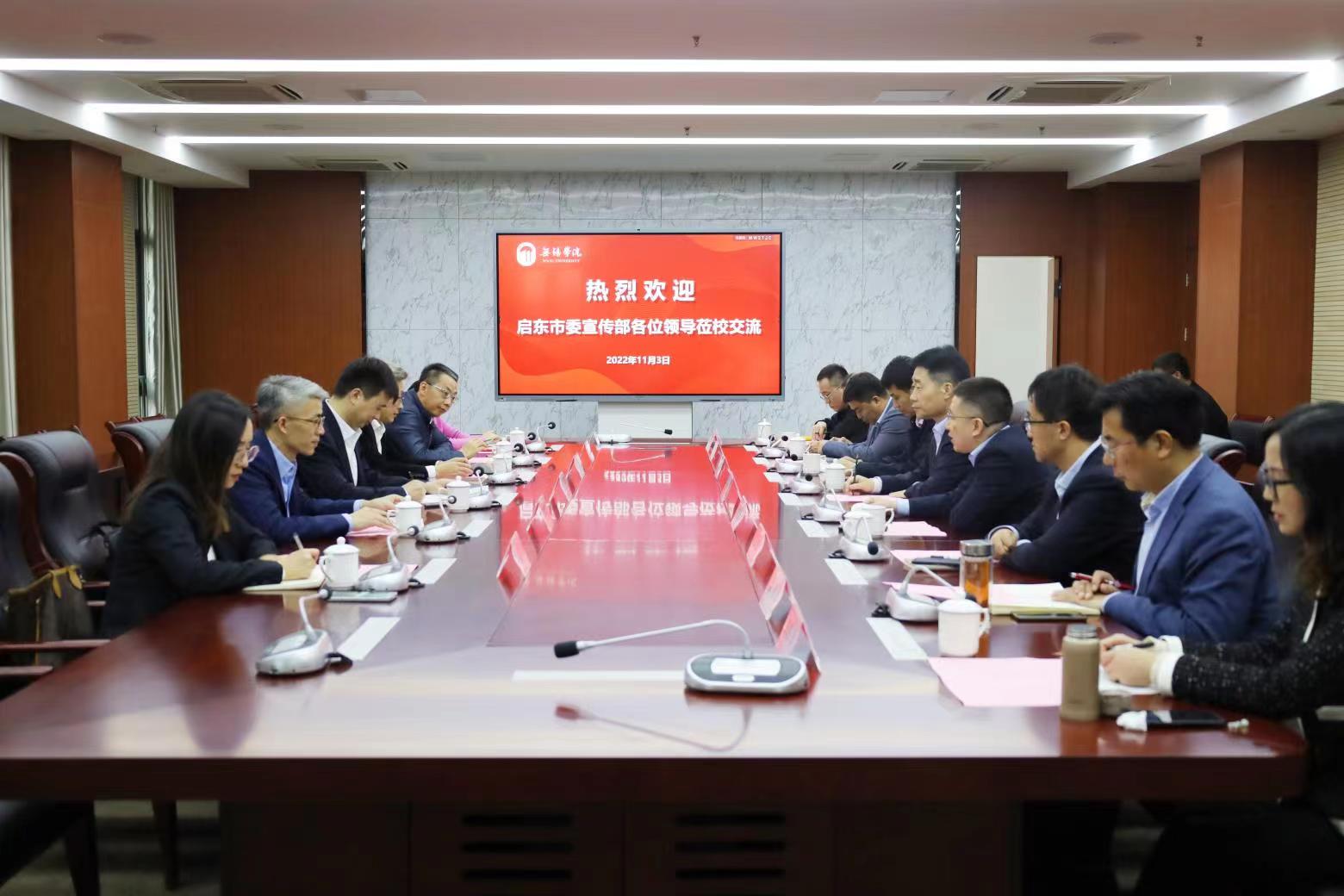 11月3日,启东市委常委、宣传部部长崔晓勇一行来我校调研交流。校党委书记杨建新,副校长徐军海,党校办、宣传部、教务处、学工处、科技处、马克思主义学院、网安基地负责人陪同调研并参加座谈会,会议由副校长徐军海主持。