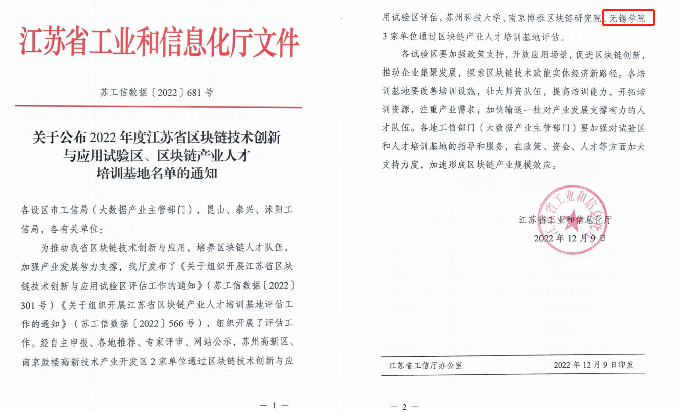 近日,江苏省工业和信息化厅下发了《关于公布2022年度江苏省区块链技术创新与应用试验区、区块链产业人才培训基地名单的通知》(苏工信数据〔2022〕681号),我校成功获批江苏省区块链产业人才培训基地。