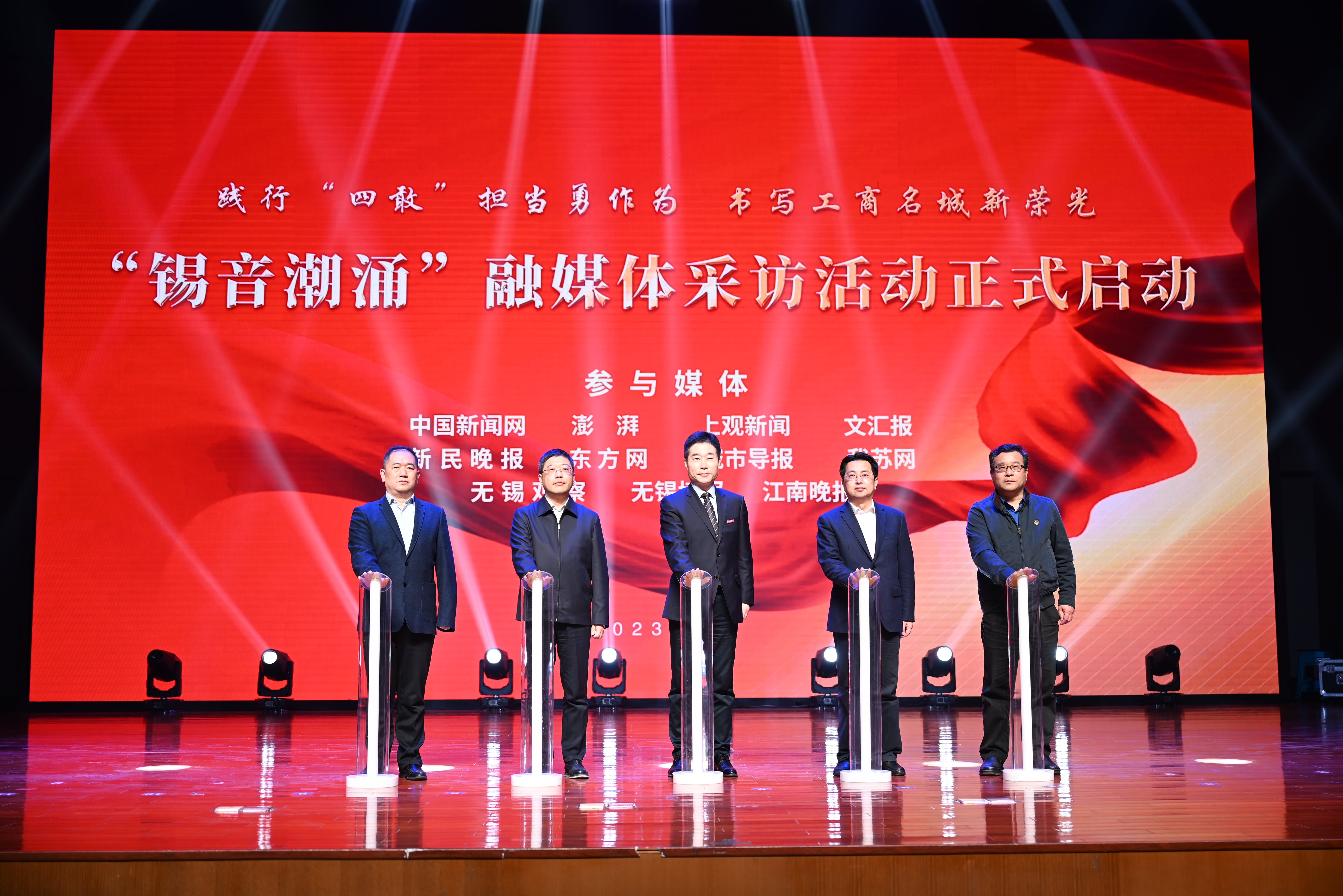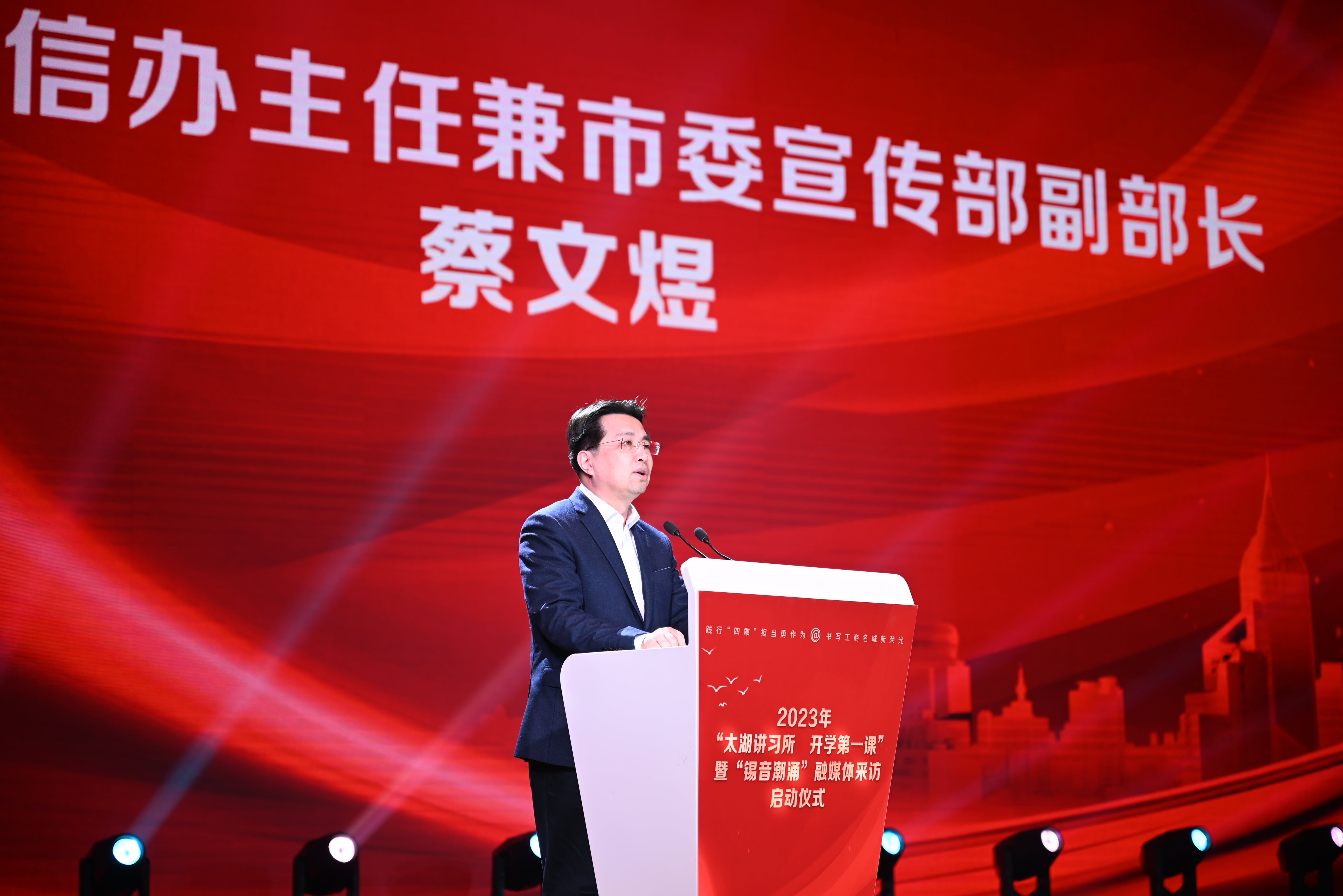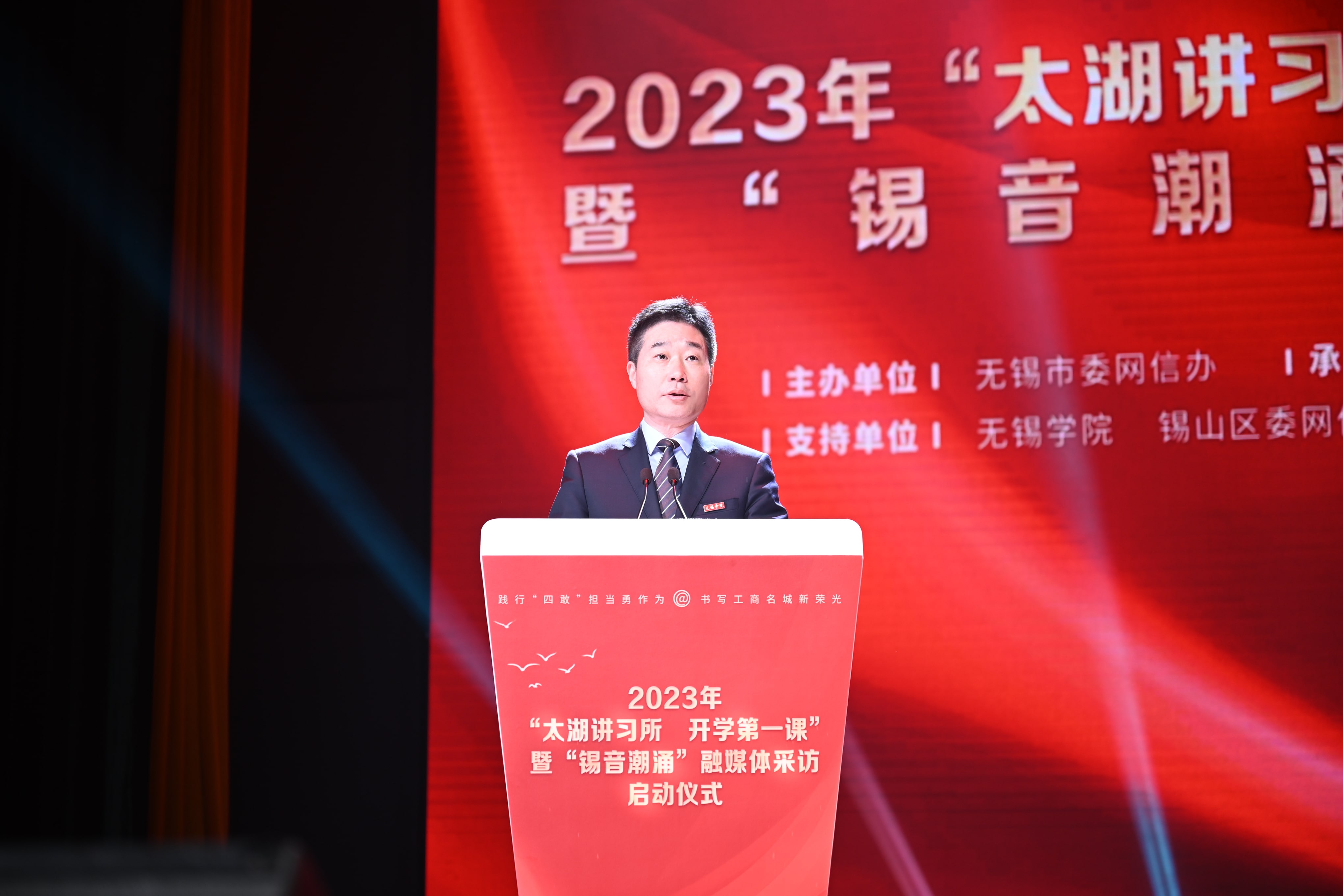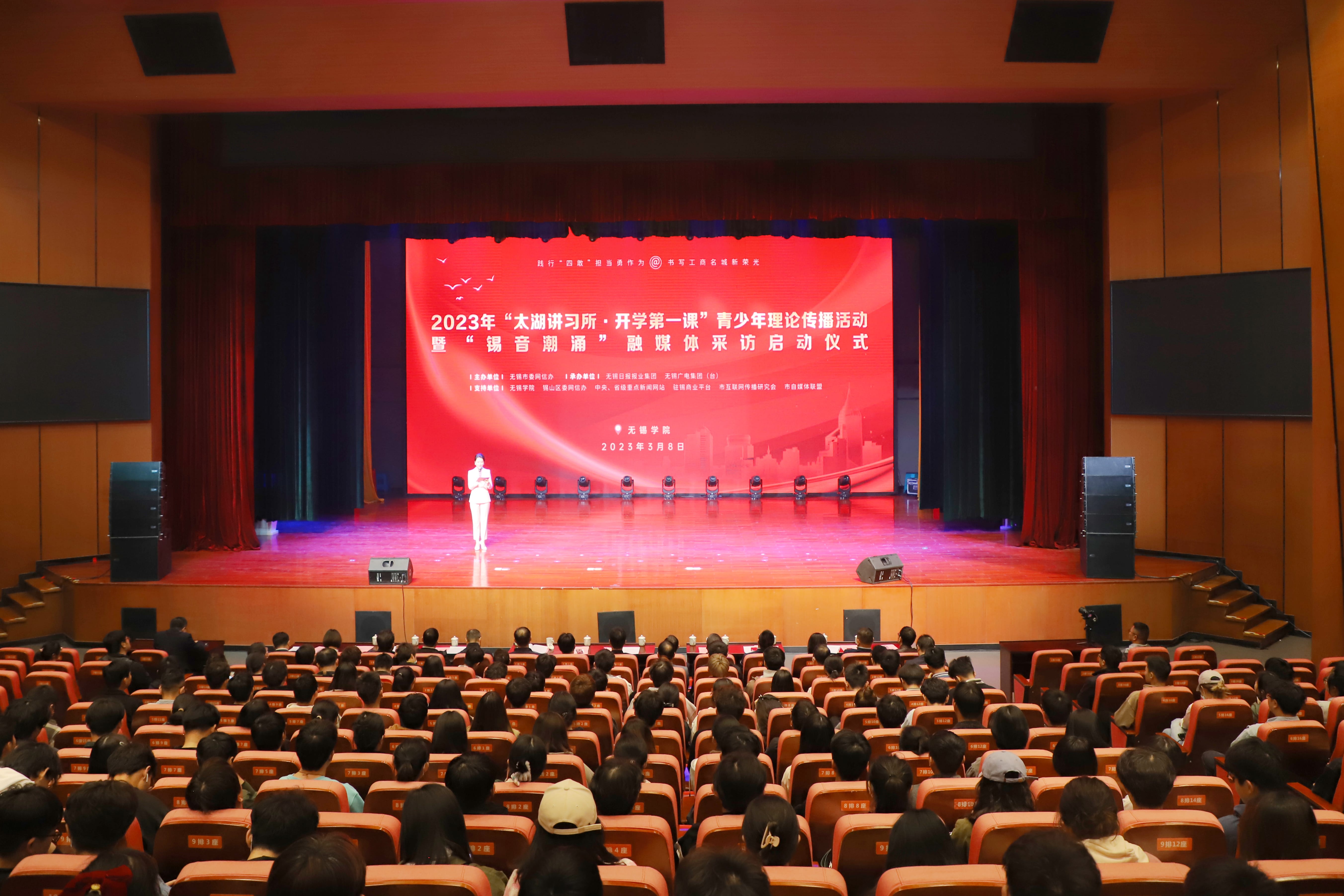 3月8日下午,2023年“太湖讲习所·开学第一课”青少年理论传播活动暨“锡音潮涌”融媒体采访启动仪式在我校滨江大礼堂隆重举行。校党委书记杨建新,无锡市委网信办主任兼市委宣传部副部长蔡文煜,校党委副书记匡辉,副校长左同宇,锡山区委副书记、宣传部部长徐悦,市委网信办副主任蹇俊,市政府教育督导办公室专职副主任冯益民,市委讲师团副团长袁伟,团市委副书记沈景倩,江南大学党委宣传部副部长梁建出席活动。中国新闻网、澎湃新闻、上观新闻、新民晚报、无锡日报、无锡广电等10余家媒体代表和我校300余名师生代表参加活动。