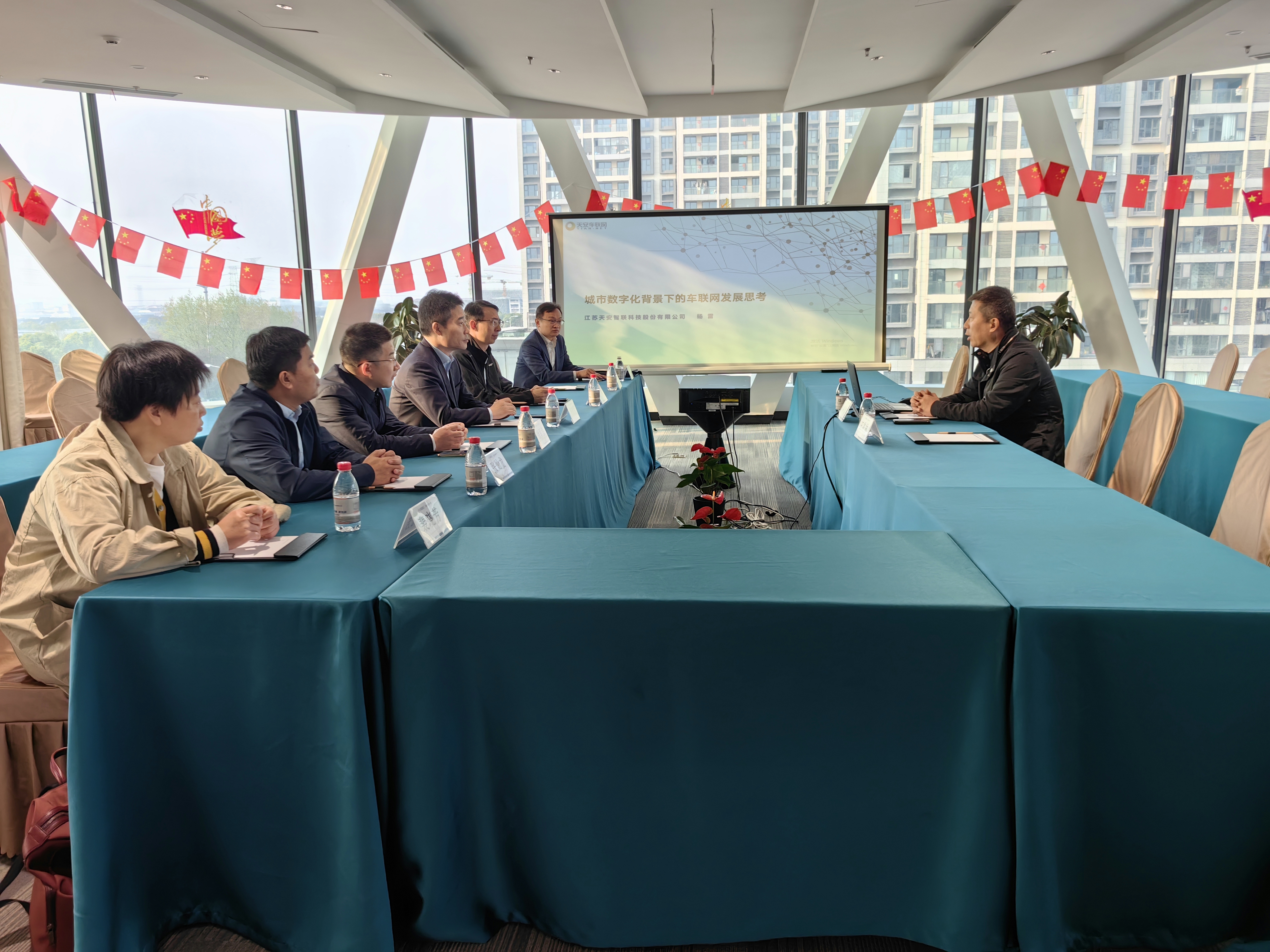 杨雷对杨建新一行的到访表示热烈欢迎,并从企业概况、主营业务、发展战略和人才需求等方面对公司进行了简要介绍。他表示,江苏天安智联科技股份有限公司作为国家高新技术企业、江苏省“专精特新”企业,专注于车联网项目规划咨询、建设管理、数据赋能及创新运营,已与包括大唐高鸿、星云互联在内的车联网产业龙头企业以及腾讯、京东在内的生态领军企业达成战略合作。杨雷指出,无锡学院的物联网工程、电子信息工程等相关专业,与公司的业务板块十分契合,双方前期在产教融合、实训基地建设等方面均进行了良好的合作,希望通过此次座谈交流,能进一步促进双方在人才联合培养、科技创新合作等方面深度融合,共同推进校企合作项目落地,实现校企双赢,共同发展。