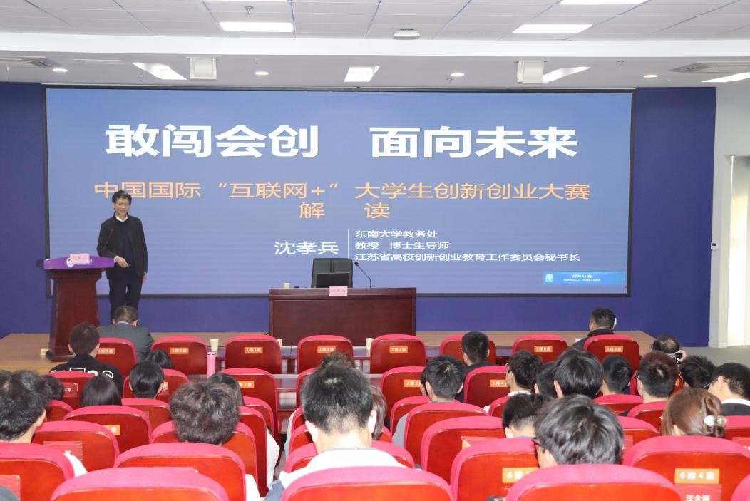 为全面部署我校第九届“互联网+”大学生创新创业大赛,激发师生投身创新创业竞赛的热情和动力,3月15日,我校第九届“互联网+”大学生创新创业大赛启动会在科创楼二楼报告厅召开。副校长曹广喜,教务处(创新创业教育学院)处长钱承山及党委学生工作部、校团委、各二级学院等有关负责同志出席会议,会议特邀代表东南大学教务处副处长沈孝兵教授作专题讲座,大赛各指导教师和项目团队、企业嘉宾等百余人参会。会议由钱承山主持。