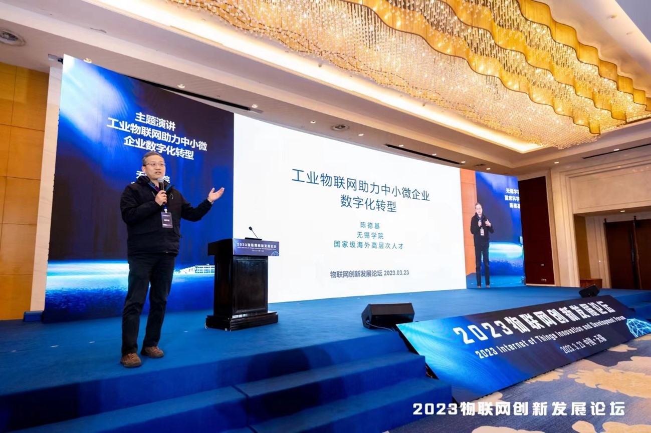 我校副校长徐军海出席本次论坛,并代表无锡学院参与了6项物联网技术标准研究成果和6项物联网国际标准化成果的成果发布仪式。我校物联网工程学院陈德基教授受邀代表无锡学院作了《工业物联网助理中小微企业数字化转型》的主题演讲。