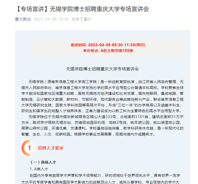 重庆大学“重大就业”微信公众号还对我校博士招聘专场宣讲会进行了宣传。梧高凤必至,花香蝶自来,此次招聘会加大了我校对省外高校博士的宣传力度,为学校加快引培高层次人才,早日实现人才强校,助推一流创新应用型大学建设起到了积极促进作用。(教务处、教学评估中心/图、文:付鹏飞;审核:钱承山)