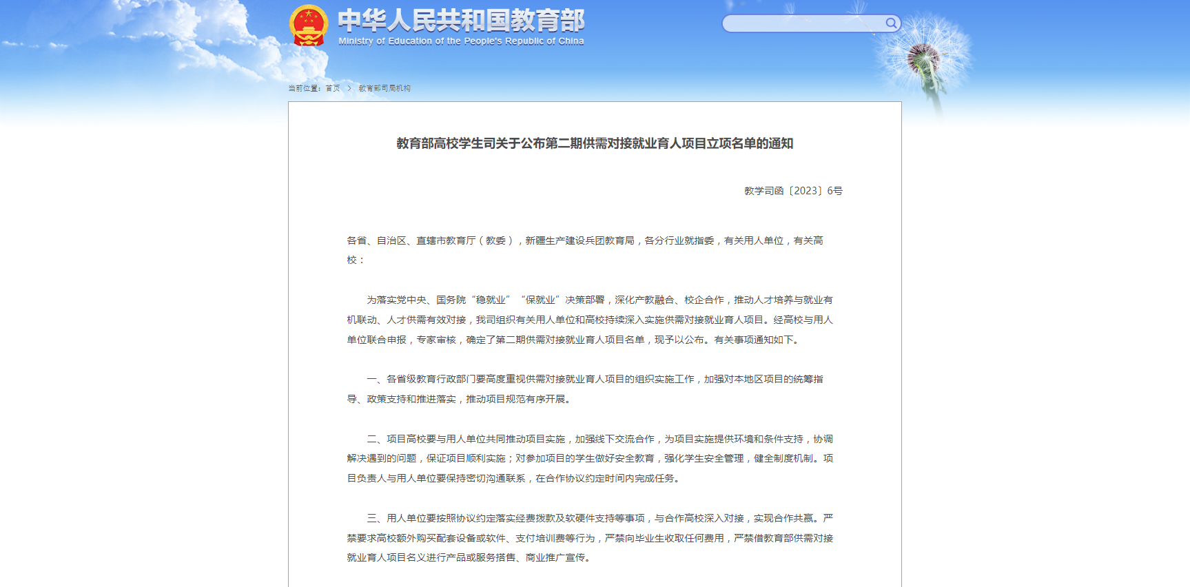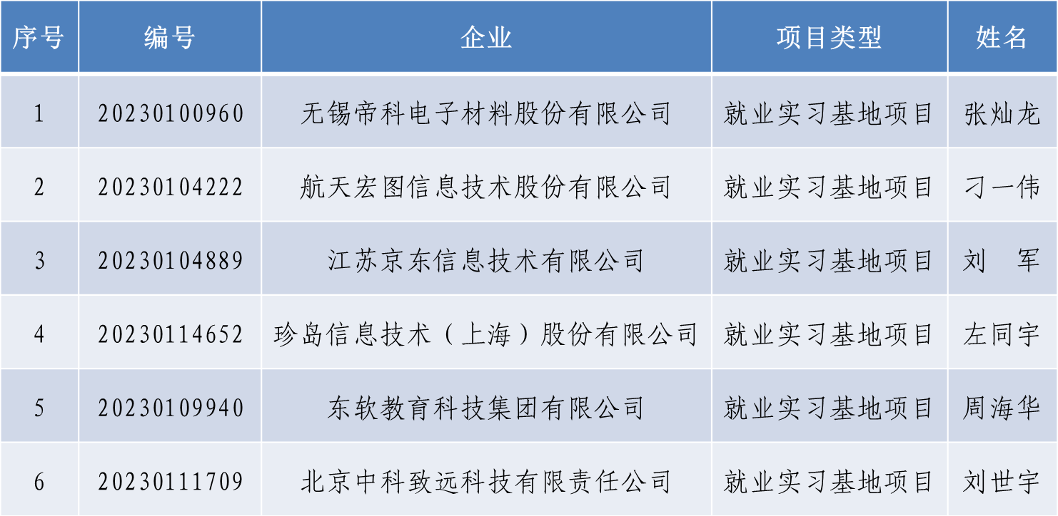 近日,教育部高校学生司下发了《关于公布第二期供需对接就业育人项目立项名单的通知》(教学司函〔2023〕6号),我校与无锡帝科电子材料股份有限公司、航天宏图信息技术股份有限公司、江苏京东信息技术有限公司、珍岛信息技术(上海)股份有限公司等6个单位联合申报的6个就业育人项目成功通过审批,获准立项,立项数量比第一期增加5项,实现新的突破。