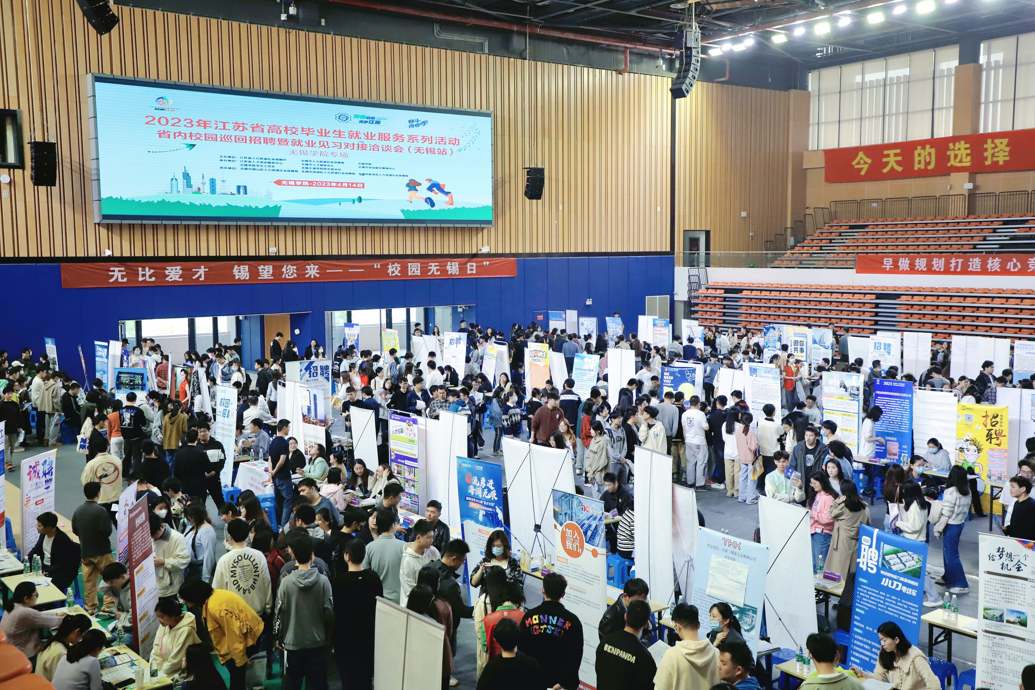为深入贯彻落实党的二十大精神,抢抓高校毕业生求职关键期,做好2023届毕业生就业服务工作,助力高校毕业生高质量充分就业。4月14日,“青春启航·逐梦江苏”江苏省高校毕业生巡回招聘暨就业见习对接洽谈会(无锡站)活动在我校体育馆成功举办。省人才流动服务中心毕业生就业工作部部长胡莹、部长助理薛明洁,无锡市人才中心主任陈曦、副主任陆星伟,我校党委书记杨建新、党委常委、副校长左同宇,各相关职能部门负责人,各二级学院辅导员、2023届及2024届毕业生生共计2000余人参加此次活动。活动以“现场招聘+直播荐岗”形式同步开展。
