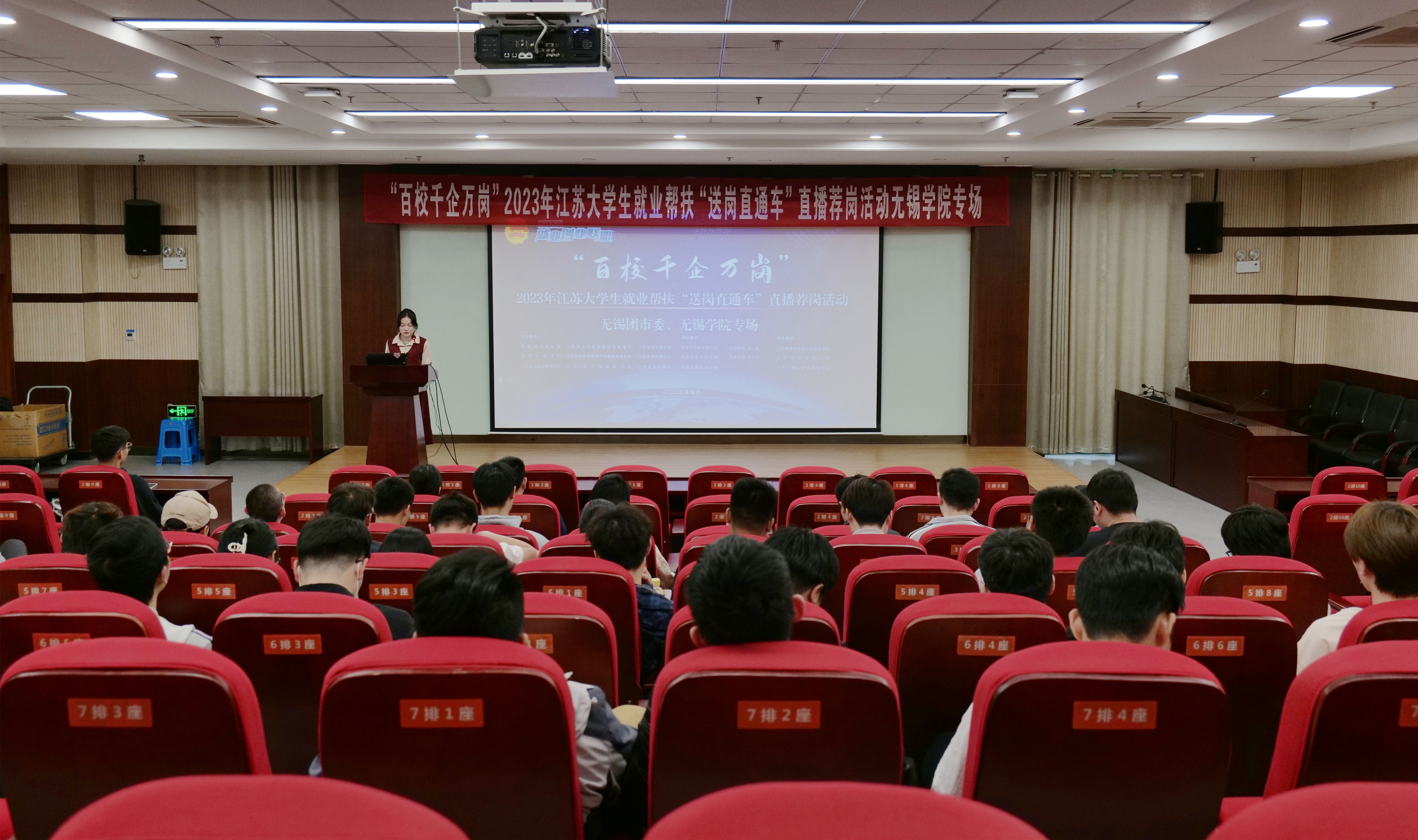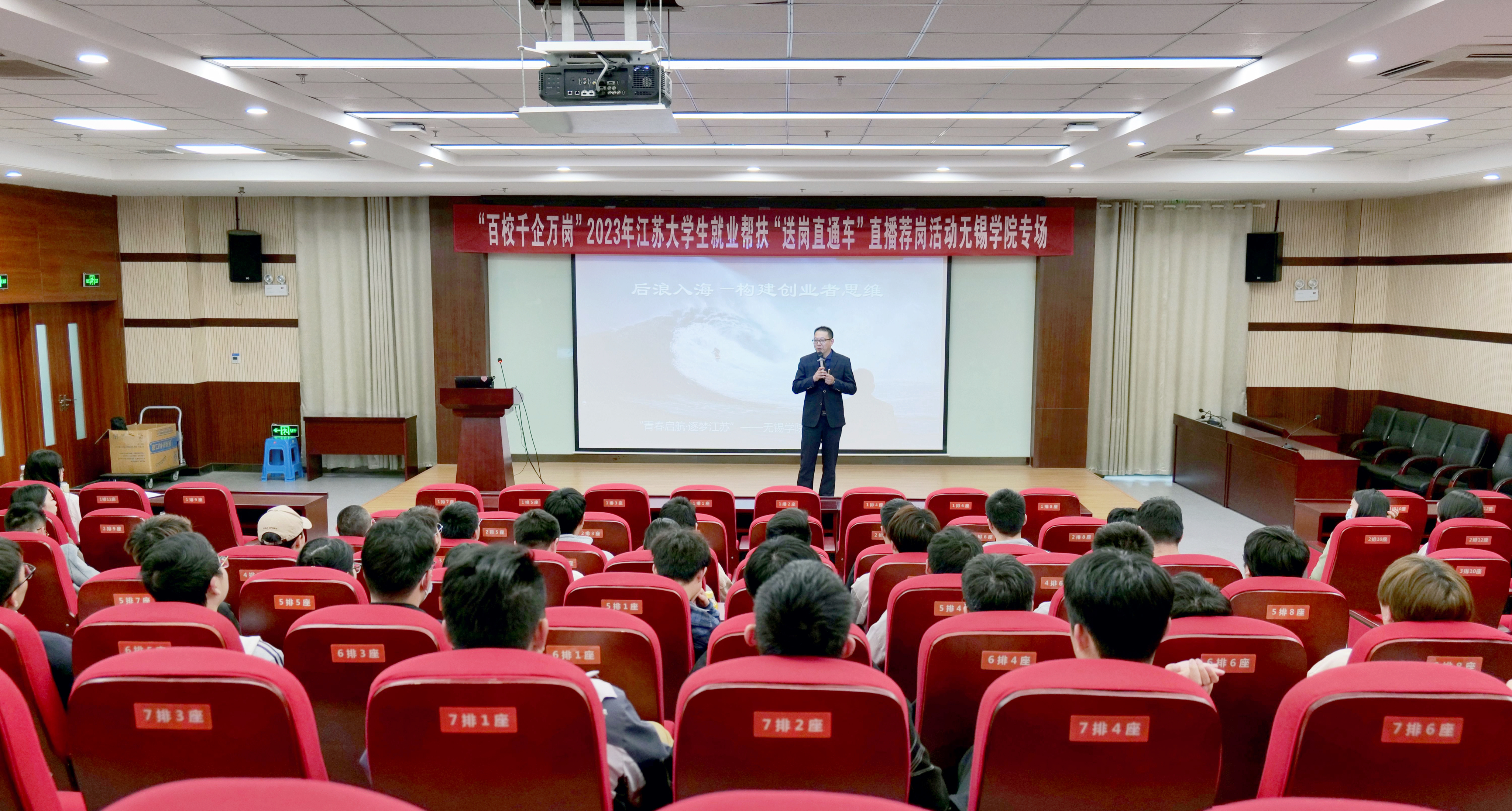 活动期间,同步开展了创业课程讲座和直播荐岗活动,中国创业培训(SIYB)讲师陈明海老师给200名同学们带来了“后浪入海-构建创业者思维”为主题讲座,以接地气的话语、鲜活的案例带领同学们了解创业环境,培养创业意识。中国电子系统工程第二建设、江苏苏嘉集团等6家企业直播荐岗,累计吸引3200人次观看。活动受到在场学生的一致好评。
