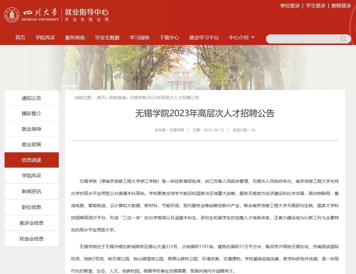 (四川大学就业中心官网对我校招聘信息进行宣传)