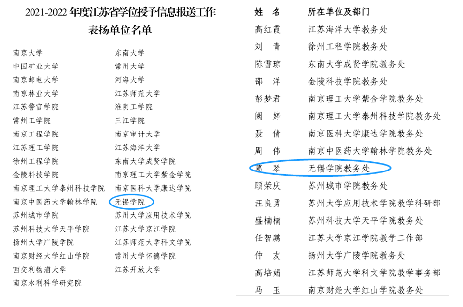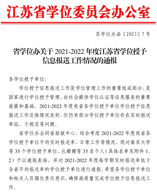 近日,江苏省学位委员会办公室发布《省学位办关于2021-2022年度江苏省学位授予信息报送工作情况的通报》(苏学位办函〔2023〕7号),我校获评“表扬单位”,教务处葛琴老师获评“表扬个人”。