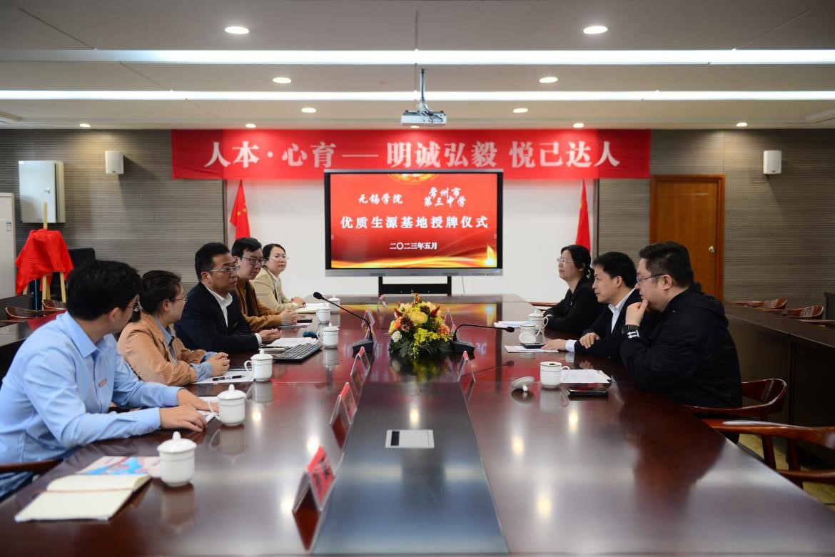 胡剑凌代表无锡学院向常州市第三中学、常州市金坛区一中进行“优秀生源基地”授牌。他对各中学长期以来支持我校招生工作表示诚挚感谢,并围绕无锡学院办学特色、学科发展、师资建设、人才培养、招生就业等方面简要介绍了学校发展情况。他希望以此次“优秀生源基地”授牌为契机,与中学建立输送和选拔更多优秀人才的有效机制,实现高中和高校的良性互动。