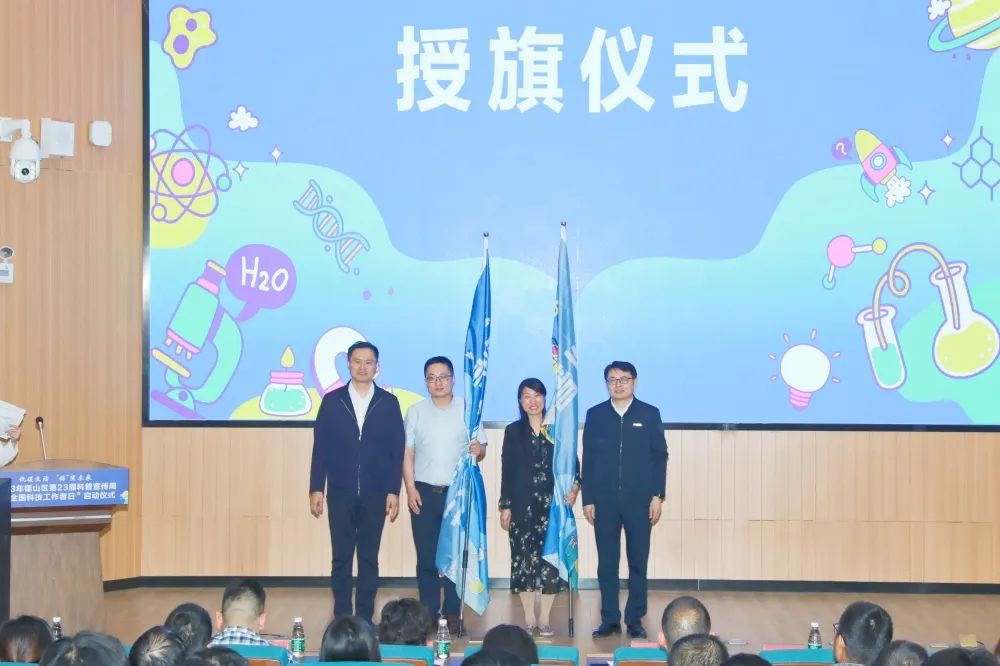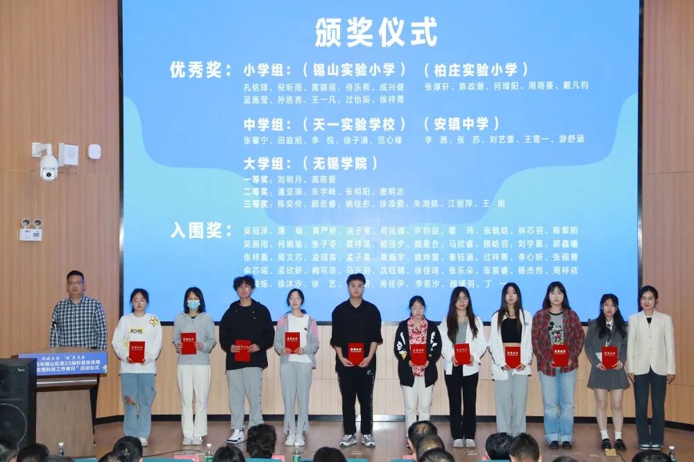 活动现场,与会领导依次为我校环境工程学院“零碳先锋”、轨道交通学院“智轨行”科普校园行活动授旗;为锡山实验小学、柏庄实验小学、羊尖实验小学、东湖塘实验小学授予“优秀科普阅读实践点单位”;为2023年锡山区“最美科技工作者”并颁发证书和奖杯;为无锡学院、天一实验学校、安镇中学、锡山实验小学、柏庄实验小学等学校遴选出的优秀海报、宣传画等获奖作品颁发证书和奖品。