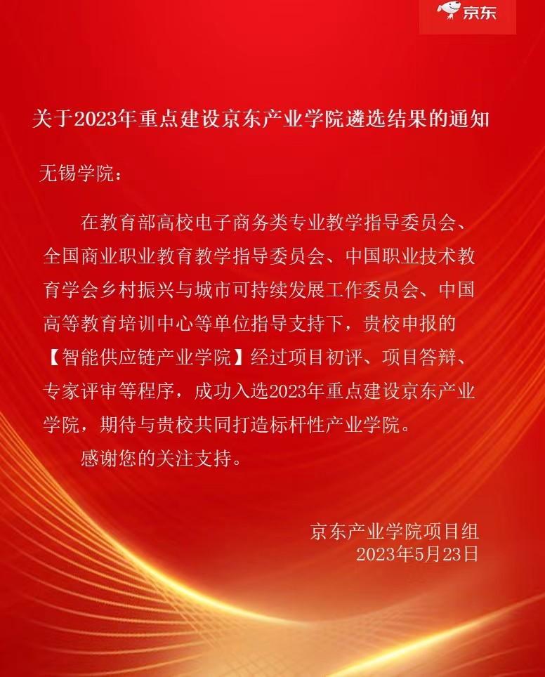 我校数字经济与管理学院依托管理科学与工程“十四五”重点学科和中国(无锡)跨境电子商务综合试验区研究院,围绕物流管理、国际贸易与经济、市场营销等专业的数智化发展,与京东共建“智能供应链产业学院”,联合打造集人才培养、科学研究、技术创新、创新创业等功能于一体的示范性产业学院。