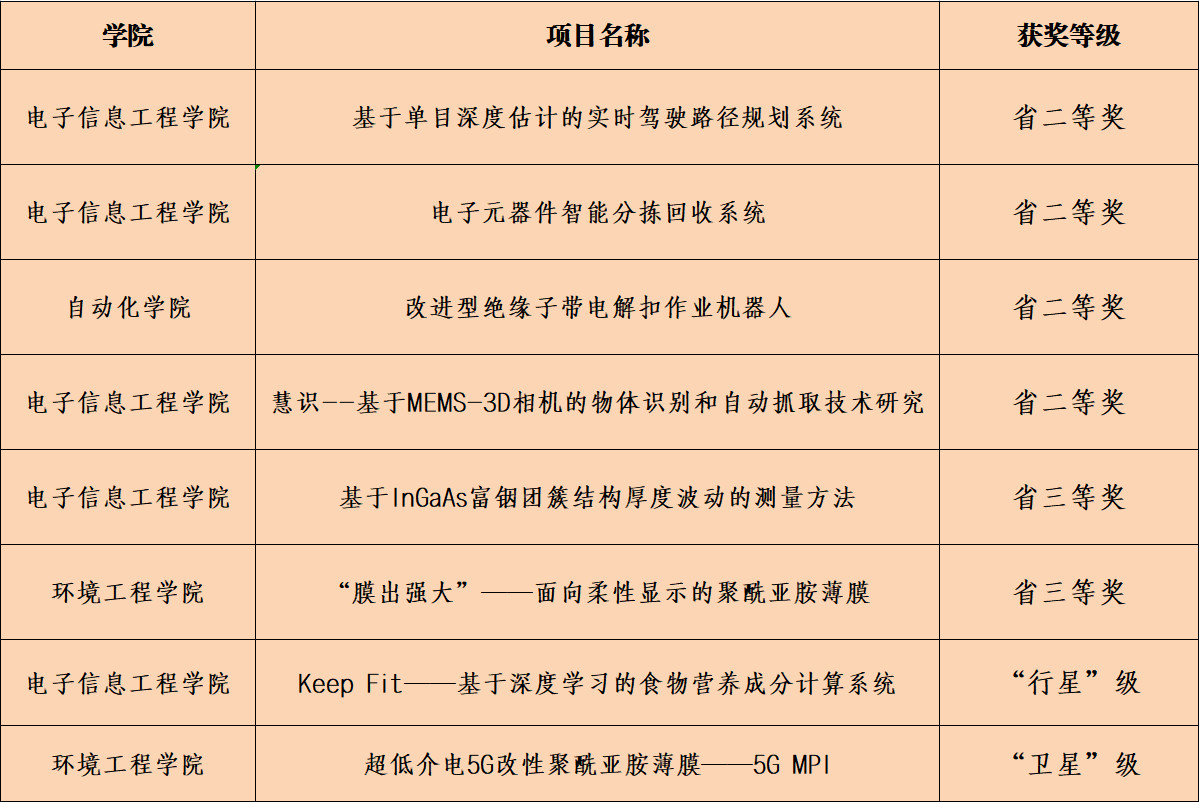 本届比赛,我校共上报11个省赛参赛作品,其中主赛道6个项目,黑科技赛道5个项目。经过线上评审,共有5项作品入围主体赛省赛决赛,1项作品入围黑科技专项赛省赛决赛。经过激烈角逐,最终,我校主体赛4个项目获得省二等奖、2个项目获得省三等奖;黑科技赛道1个项目获得“行星”级、1个项目“卫星”级。相比往届,入围省赛决赛项目数量、荣获省赛奖项数量、参赛师生人数都创历史新高。