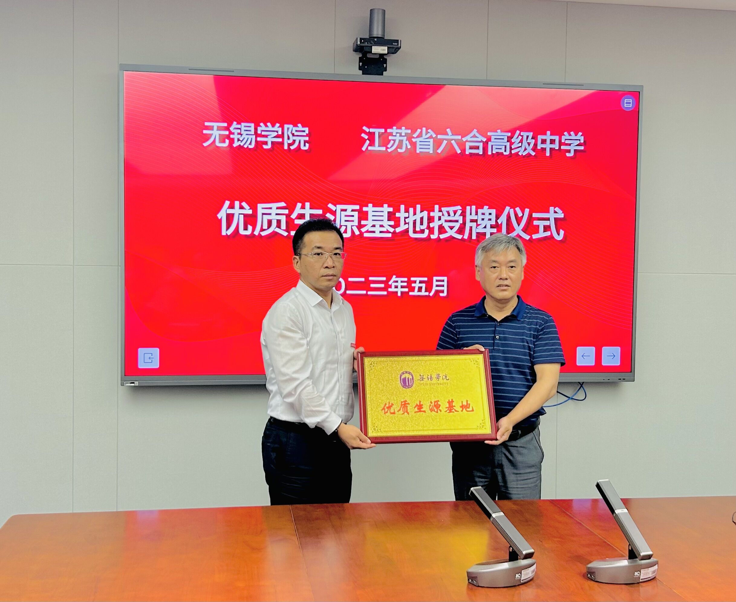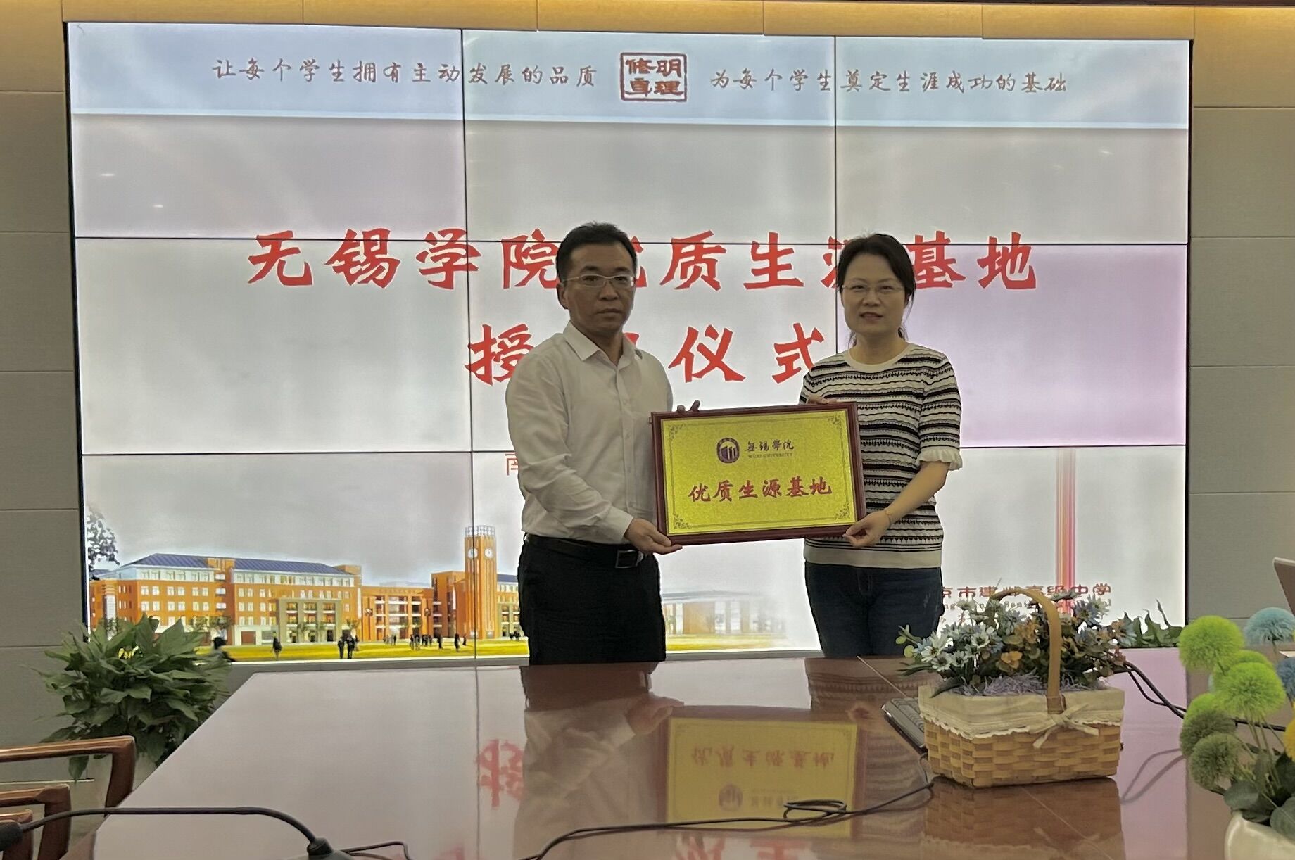 胡剑凌代表无锡学院向两所学校进行“优秀生源基地”授牌。他对各中学长期以来支持我校招生工作表示诚挚感谢,并围绕无锡学院办学历史、学科发展、师资建设、人才培养、产教融合等方面简要介绍了学校发展情况。他希望以此次“优秀生源基地”授牌为契机,与各中学建立输送和选拔优秀人才的有效机制,实现高中和高校的良性互动,推进双方学校事业的高质量发展。