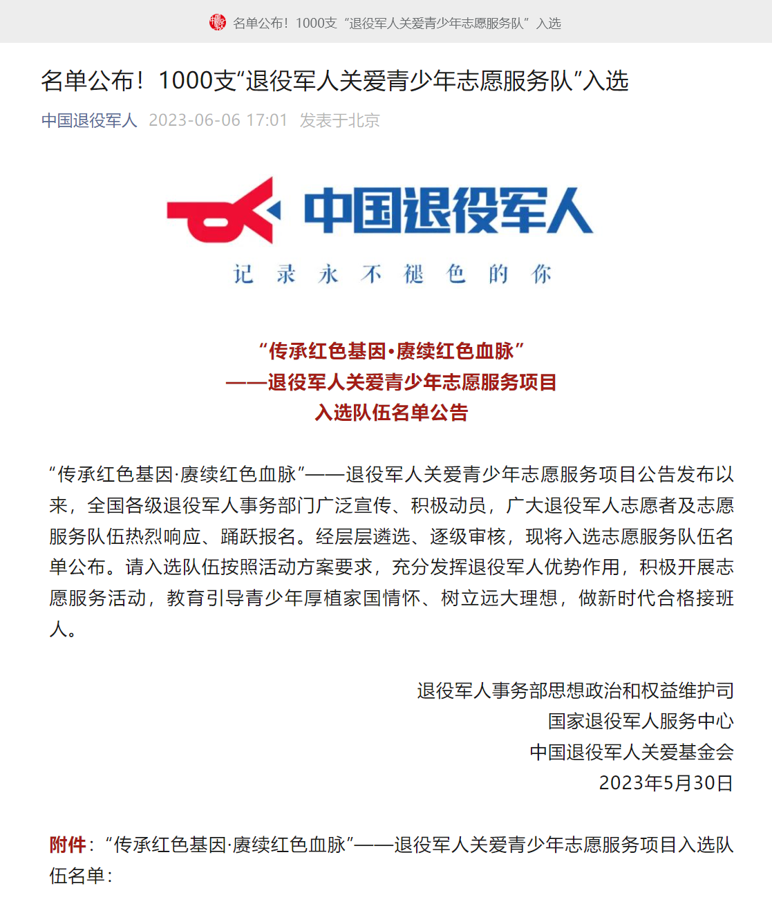 为示范带动退役军人志愿服务活动深入开展,退役军人事务部于今年4月在全国范围组织开展“传承红色基因·赓续红色血脉”——退役军人关爱青少年志愿服务项目,最终遴选出1000支团队。我校高度重视,在全校范围内开展遴选,统筹推进团队的各项申报工作,最终成功入选。