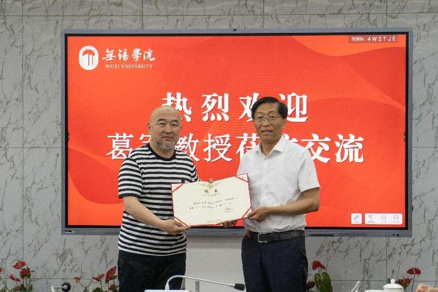 张永宏对葛军受聘为我校特聘教授表示欢迎,并为葛军颁发了特聘教授聘书。葛军对学校的发展建设成果给予了充分肯定,表示很高兴成为无锡学院特聘教授,感谢学校的认可与信任,以后将竭尽全力为学校教育教学、人才培养、教师队伍建设、文化建设等方面贡献智慧和力量。