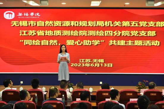 为深入学习贯彻习近平新时代中国特色社会主义思想和党的二十大精神,以项目共建、资源共享、活动共谋、合作共促等方式,切实加强党组织的横向交流与跨界合作,表彰优秀学子,发挥模范带头作用,提升学院专业建设育人成效,6月13日下午,无锡市自然资源和规划局党委委员、副局长陈艳,江苏省地质测绘院党委书记冒爱泉一行来校合作交流,开展“同绘自然,爱心助学”党支部共建主题活动。校党委副书记匡辉,大气与遥感学院院长卢楚瀚、党总支副书记范雪及相关专业负责人出席活动。