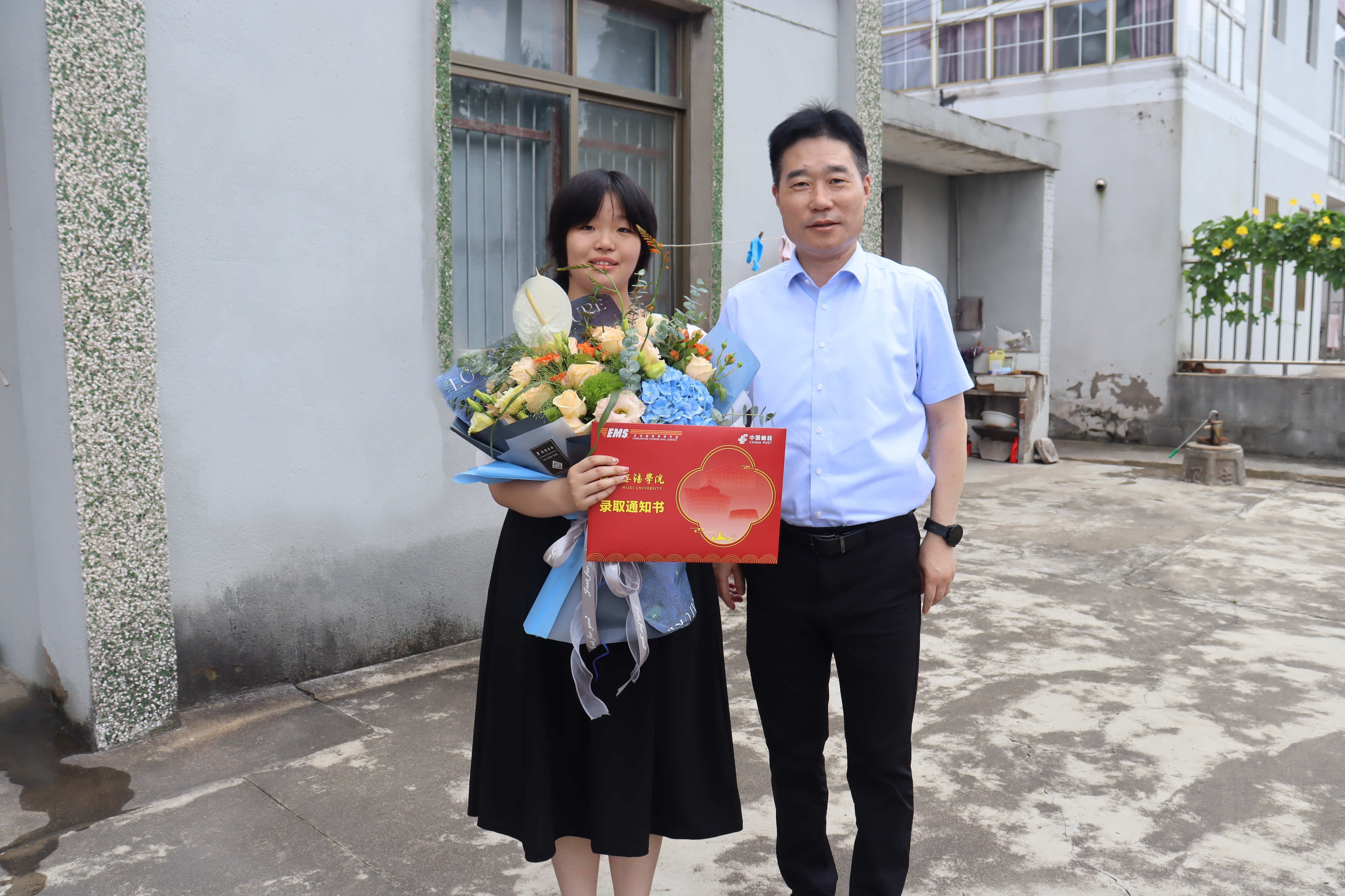 校党委书记杨建新为佘情雨同学送录取通知书和鲜花合影留念