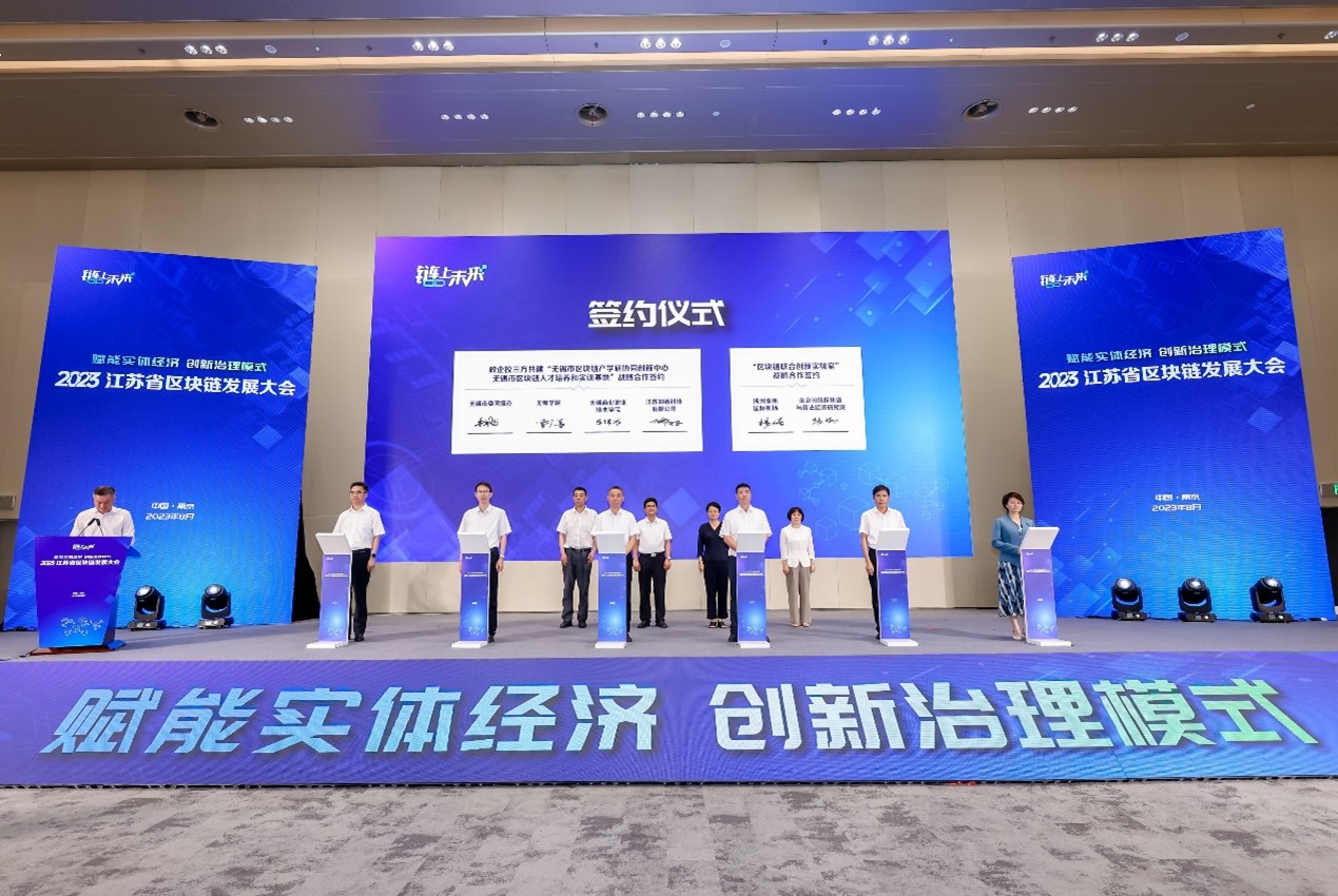8月3日下午,由江苏省委网信办和南京江北新区管委会主办、江苏省区块链发展协会承办的2023江苏省区块链发展大会在南京举行。省委宣传部副部长、省委网信办主任杨力群,省通信管理局局长、省区块链发展协会理事长许继金,南京市委常委、南京江北新区党工委书记杨学鹏等领导出席会议,来自政行企校共200多名嘉宾代表参会。我校副校长曹广喜带队参加了本次大会。