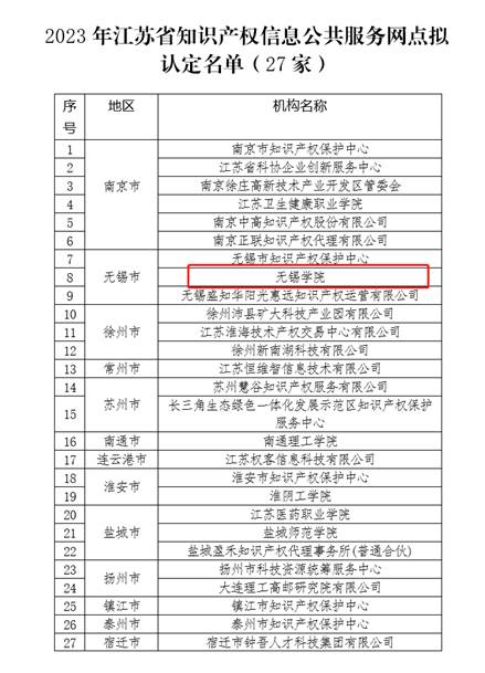 此次入选省级知识产权信息公共服务网点,将进一步助推我校知识产权应用平台建设。学校将以此次入选为契机,立足无锡,面向全省,结合自身特点和优势,广泛开展知识产权信息查询、信息检索、事务咨询、公益培训、政策宣传等基本信息公共服务,围绕政府、高校和企业的知识产权信息服务和知识产权人才培训需求,开展区域知识产权战略布局、产业专利导航运用、企业知识产权管理、科技成果转化信息服务、知识产权人才培养等知识产权信息服务工作。以“机构实体化、运行科学化、队伍专业化、服务特色化、条件信息化”为建设目标,充分发挥省级知识产权信息公共服务网点作用,推动知识产权和区域产业、科技、经济的深度融合,为知识产权强省建设提供有力支撑。(科技处(社科处)/文:唐雨;审核:延星)