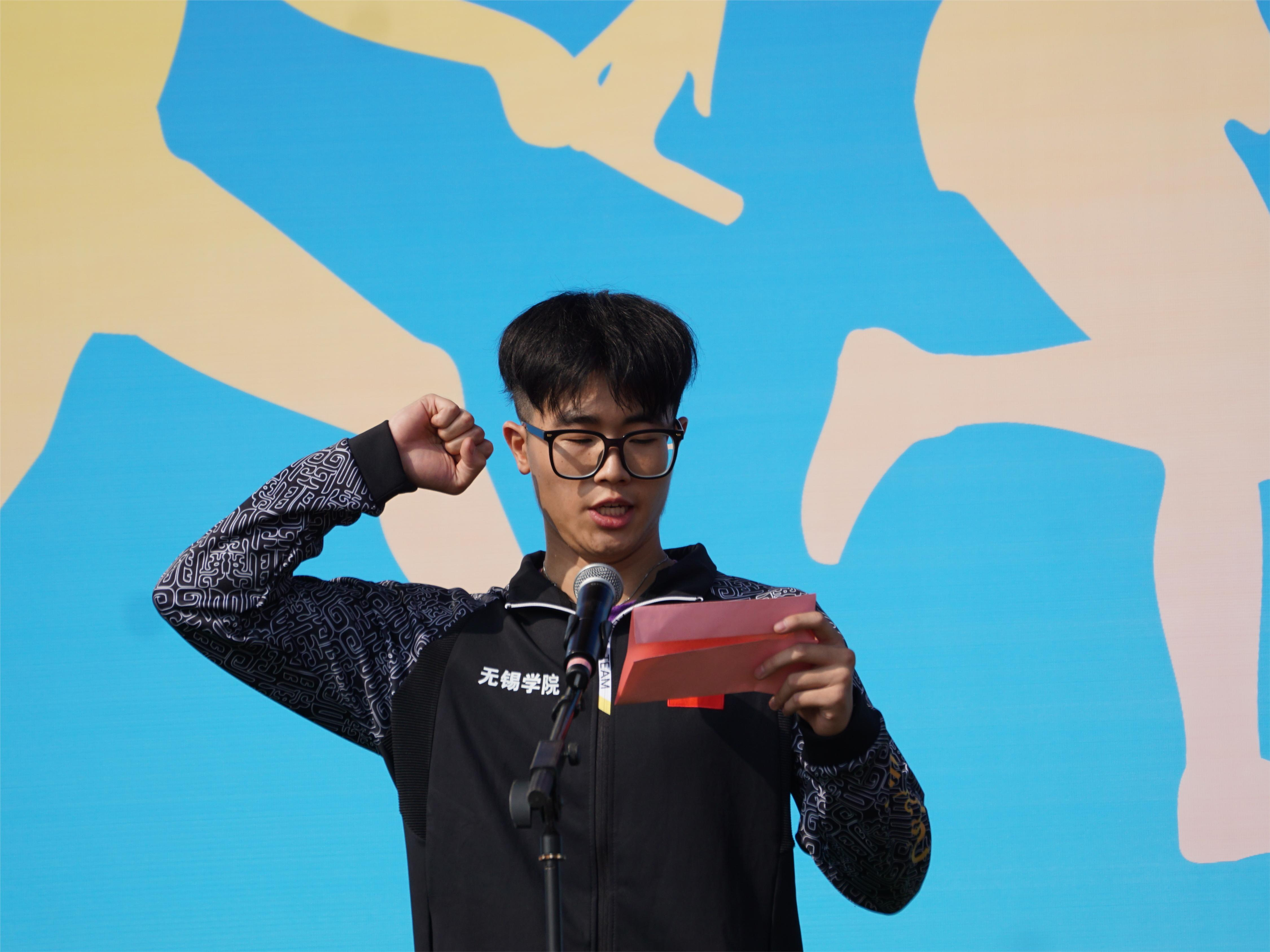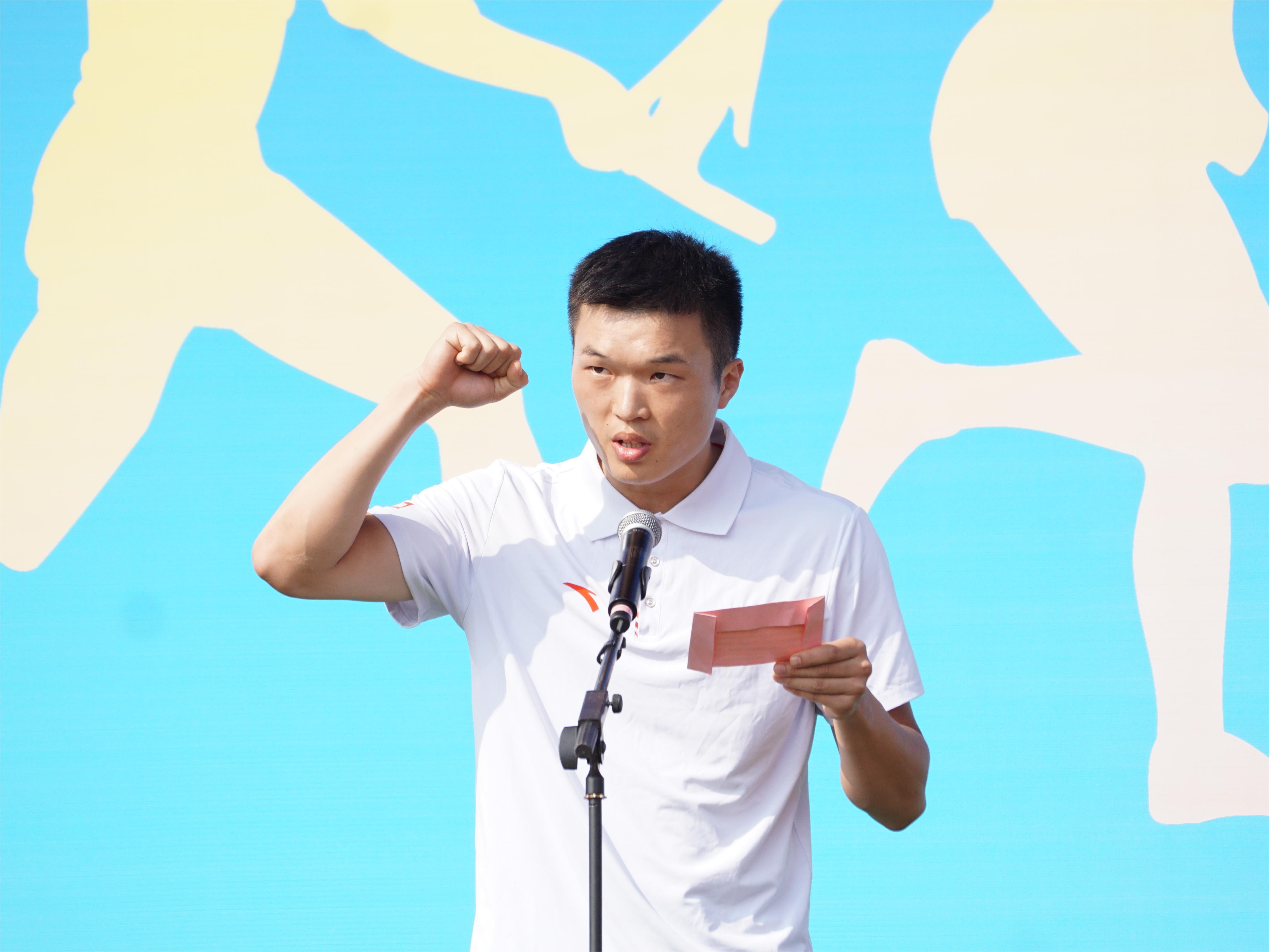 运动员代表毛贇杰宣誓,严格遵守比赛规则,尊重裁判,尊重对手,友谊第一、比赛第二,以更高、更快、更强为目标,发挥出最佳成绩。裁判员代表张洋静宣誓,严格遵守竞赛规则和裁判员纪律,尊重参赛选手,礼貌裁判,严肃认真,不徇私情,遵循公平、公正、公开的原则圆满完成裁判工作。