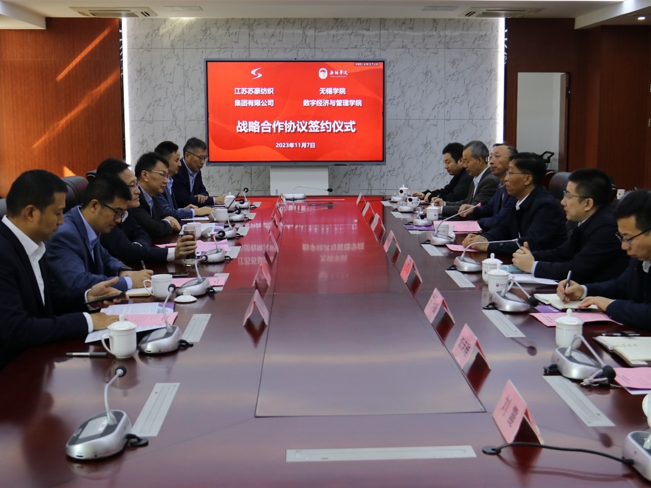 11月7日上午,江苏苏豪控股集团副总裁丁海一行来我校洽谈合作,江苏苏豪纺织集团董事长伍栋、副总经理刘超、人力资源部主任张仁乐,江苏苏豪泓纲科技有限公司董事长金昊,江苏省纺织研究所股份有限公司总经理濮平,江苏汇鸿国际集团中鼎控股股份有限公司办公室主任杨智等参加会议。我校校长张永宏,副校长徐军海,人事处、科技处、发展规划处、数字经济与管理学院相关负责人及相关教师代表参加会议。会议由徐军海主持。