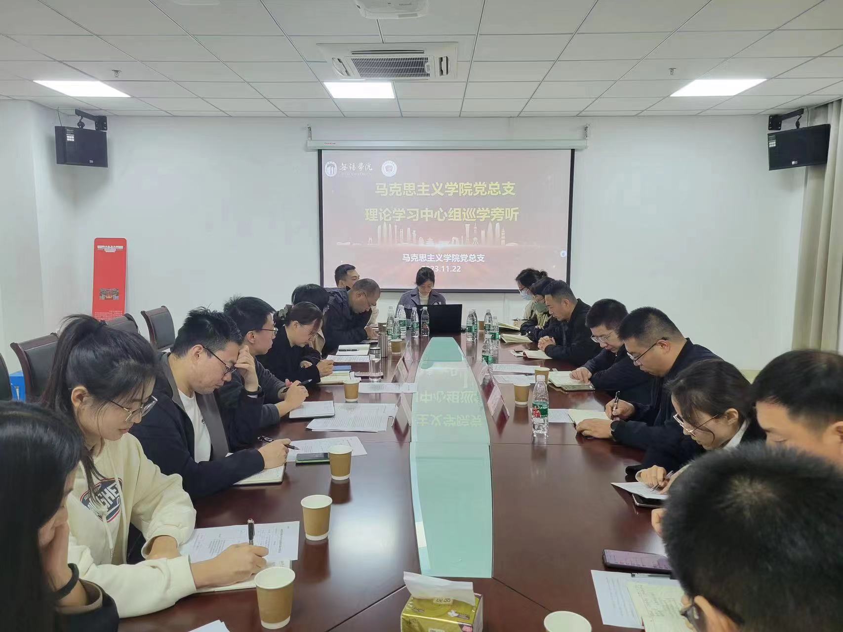 11月22日下午,马克思主义学院党总支理论学习中心组在尚真楼110会议室召开会议,专题学习党的二十大精神和全国宣传思想文化工作会议精神,副校长徐军海莅临马克思主义学院巡学旁听。会议由马克思主义学院副院长沈妉主持,学院党总支全体成员及教师代表参加了会议。
