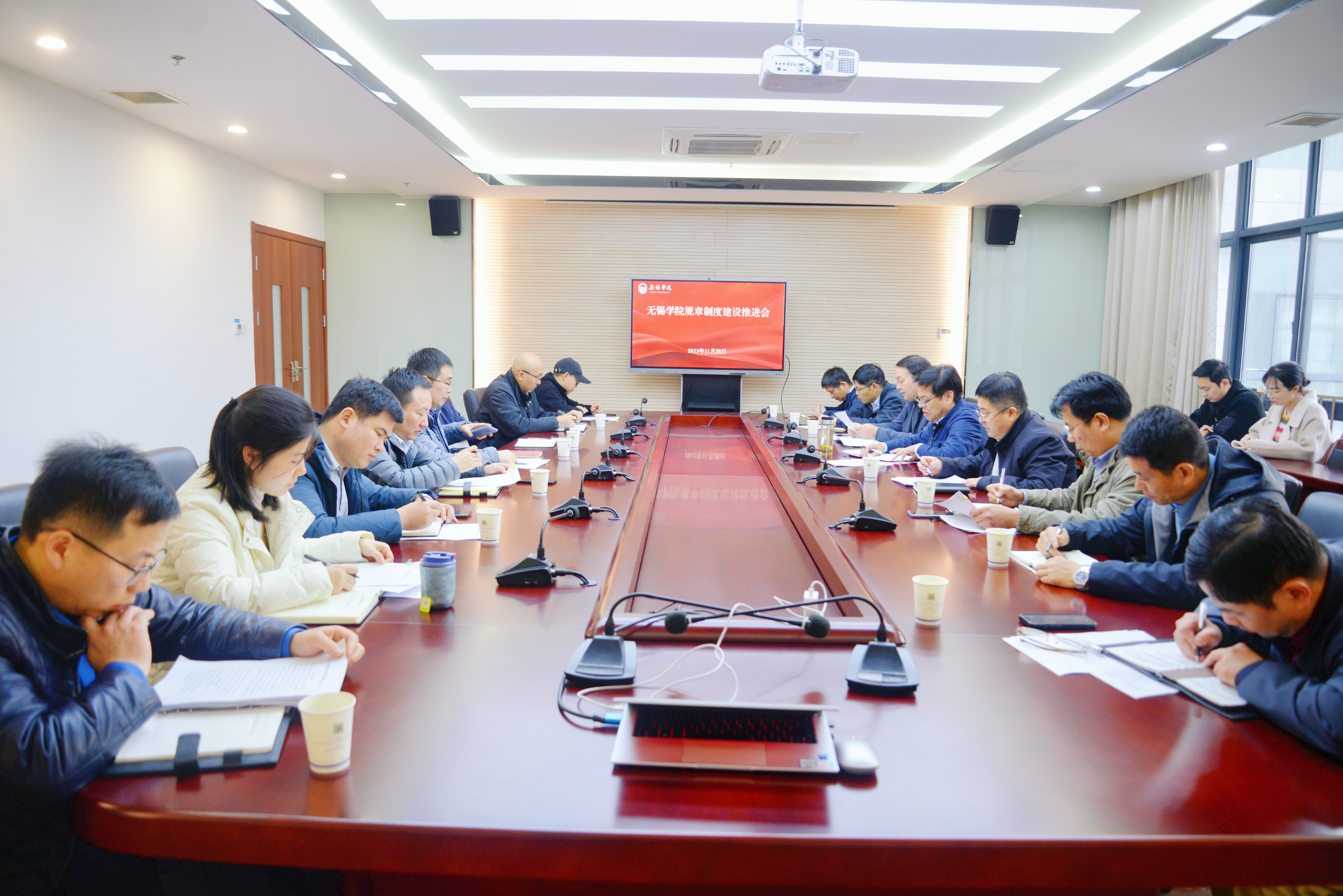 11月28日下午,我校在行政楼301会议室召开规章制度建设推进会,学习领会习近平总书记有关制度建设的重要论述精神,总结学校前期规章制度建设成果,明确下一步建设任务和工作要求。校党委常委、纪委书记王友明主持会议并讲话,各职能部门负责人参加会议。