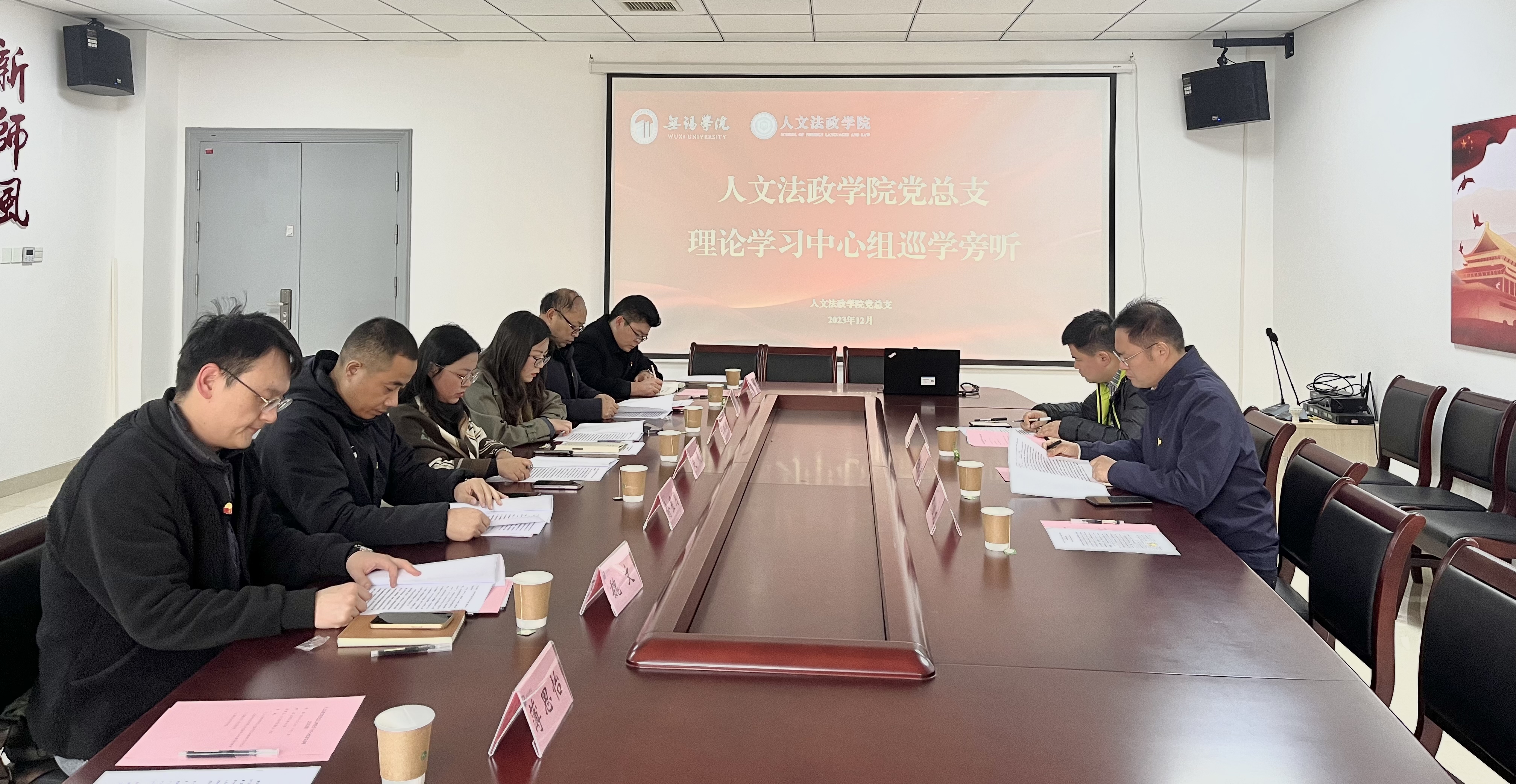 12月6日下午,人文法政学院党总支理论学习中心组在尚真楼208会议室召开会议,专题学习习近平总书记在中共中央政治局就建设教育强国进行第五次集体学习时发表的重要讲话精神。副校长左同宇莅临人文法政学院巡学旁听,保卫处副处长陈翀陪同参加。会议由人文法政学院副院长赵岚主持,党总支理论学习中心组成员参会学习。