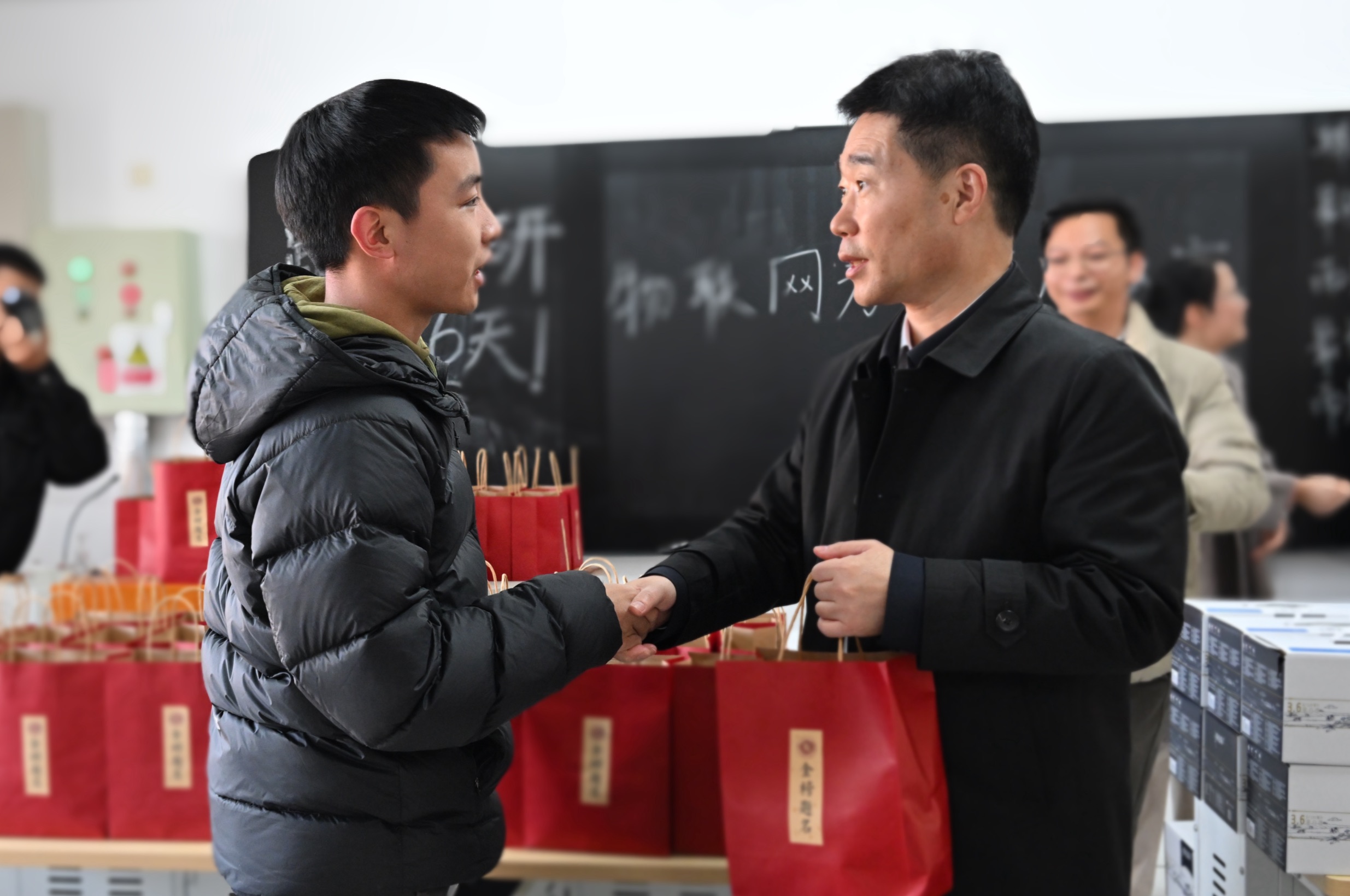 杨建新亲切问候考研学生,对同学们努力拼搏,逐梦考研的学习态度给予肯定。他指出,学校高度重视学生考研工作,始终把考研作为人才培养质量的一项重要指标,努力营造良好的学习环境。他贴心地为考研学生送上了精心准备的“考研加油包”,勉励同学们以更加坚定的信念、更加充足的干劲迎接考试,祝愿所有学生“苹”稳上岸,一战“橙”硕。左同宇鼓励考研学生奋力冲刺,用奋斗为自己的青春增光添色。