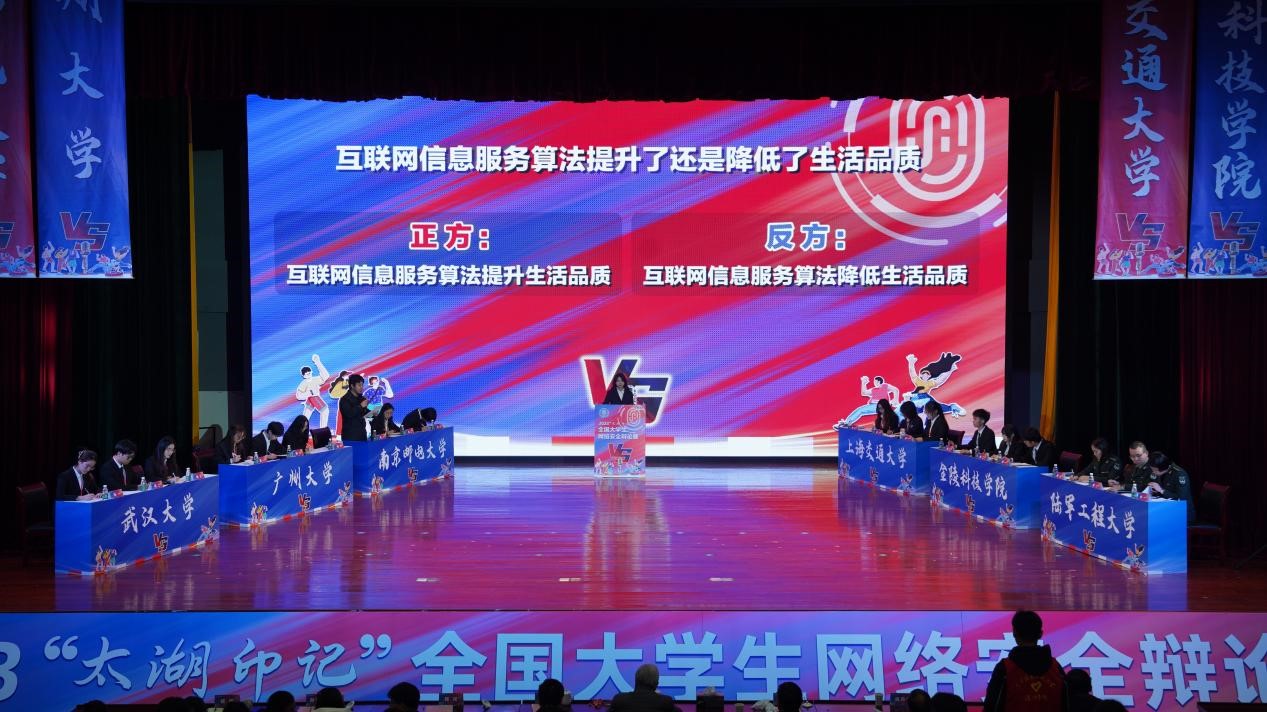 经过初赛,上海交通大学、武汉大学、金陵科技学院、广州大学、陆军工程大学、南京邮电大学6所高校的辩论队脱颖而出,入围决赛。辩手们围绕互联网信息服务算法对生活品质的影响、人工智能大模型的发展对网络安全的影响和人工智能大模型的监管技术三个辩题进行激烈辩论。“请问对方辩友,算法推荐必然导致信息茧房吗?”“反方一再论证信息算法有风险,但我方认为新技术是在不断发展和修正的”……辩论赛现场,各位辩手们唇枪舌剑,思维火花不断碰撞,在相互切磋中对网络安全有了更深入、更全面的思考。