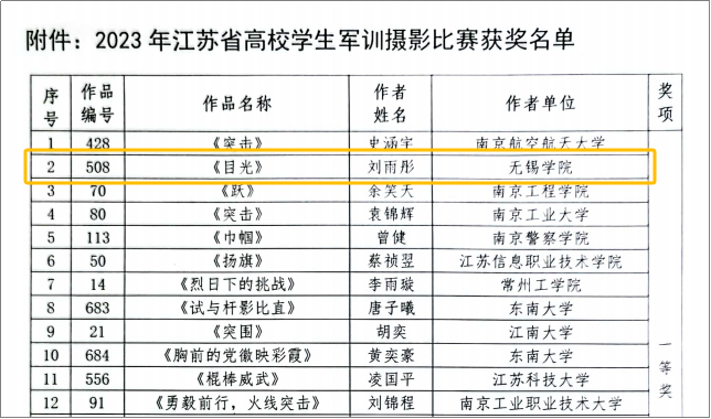 12月22日,由江苏省高教学会国防教育研究委员会主办的2023年江苏省高校学生军训摄影比赛评选结果正式公布,我校人民武装部报送的参赛作品获一等奖和二等奖各1项。