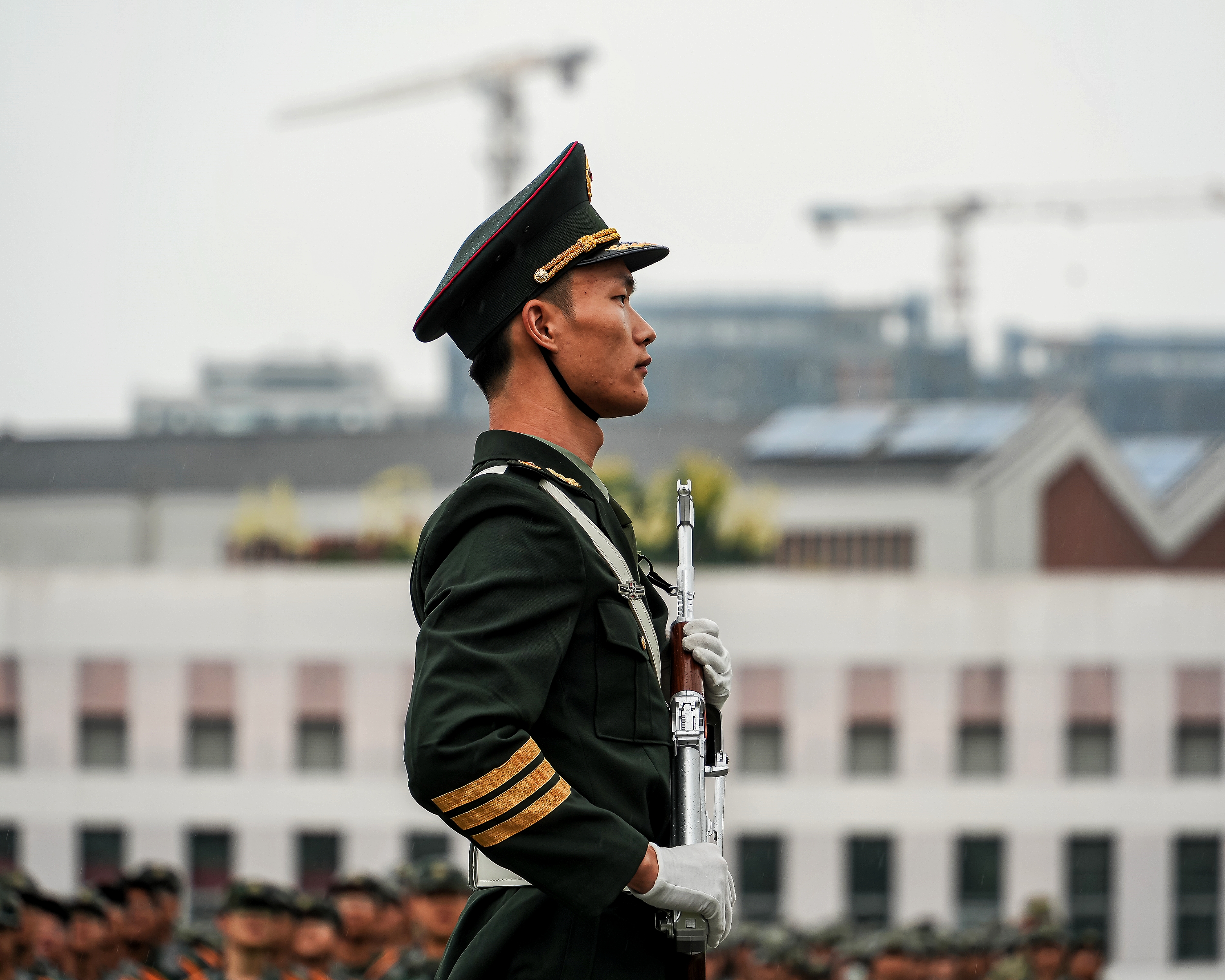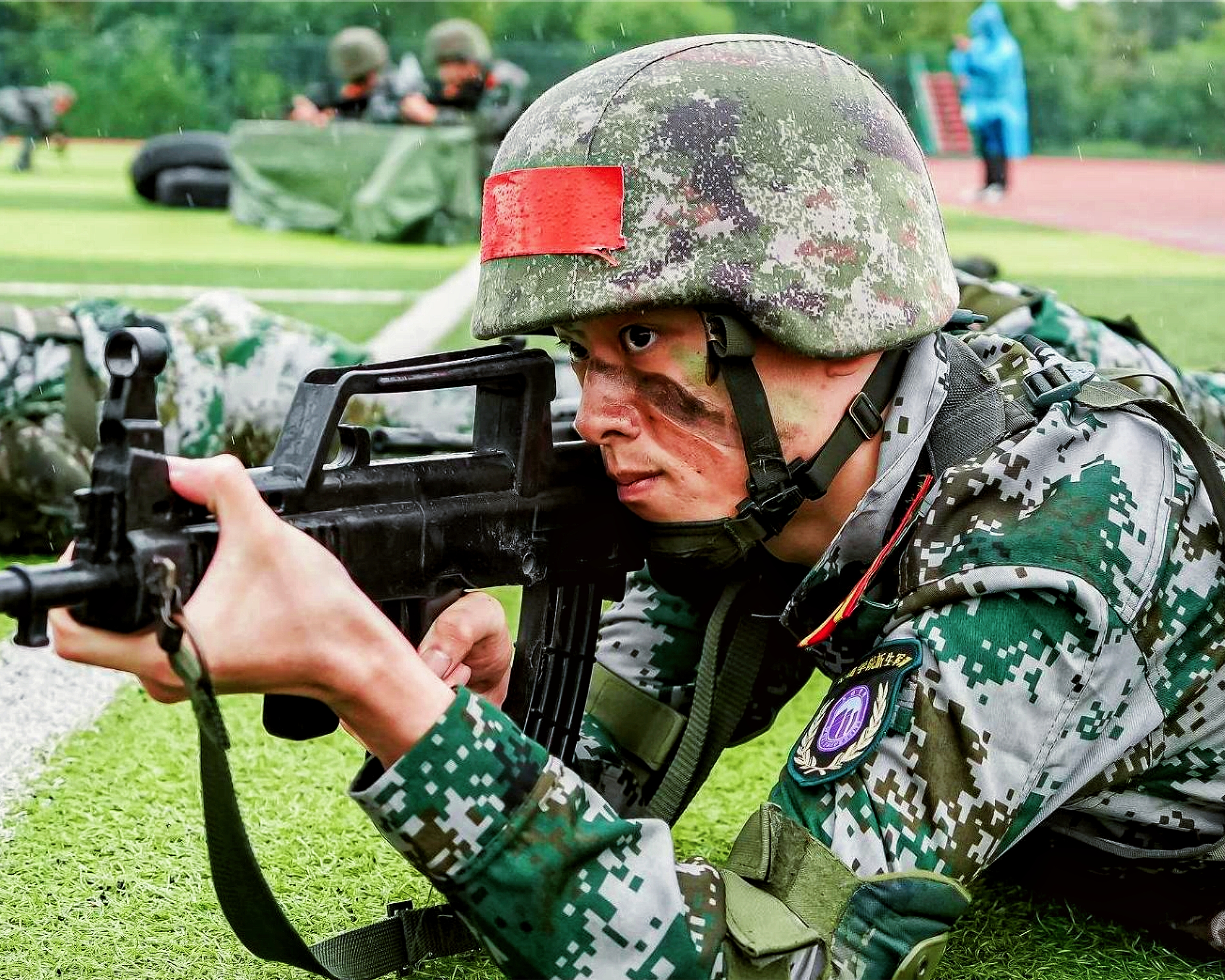 作品《目光》以独特的视角捕捉到了在细雨中瞄准“敌方”阵营的退役学生坚定的目光。作品《使命担当》拍摄了校大学生国旗护卫队护旗手,此刻他正身姿笔挺的手握礼宾枪,眼神坚毅的望向前方的五星红旗。