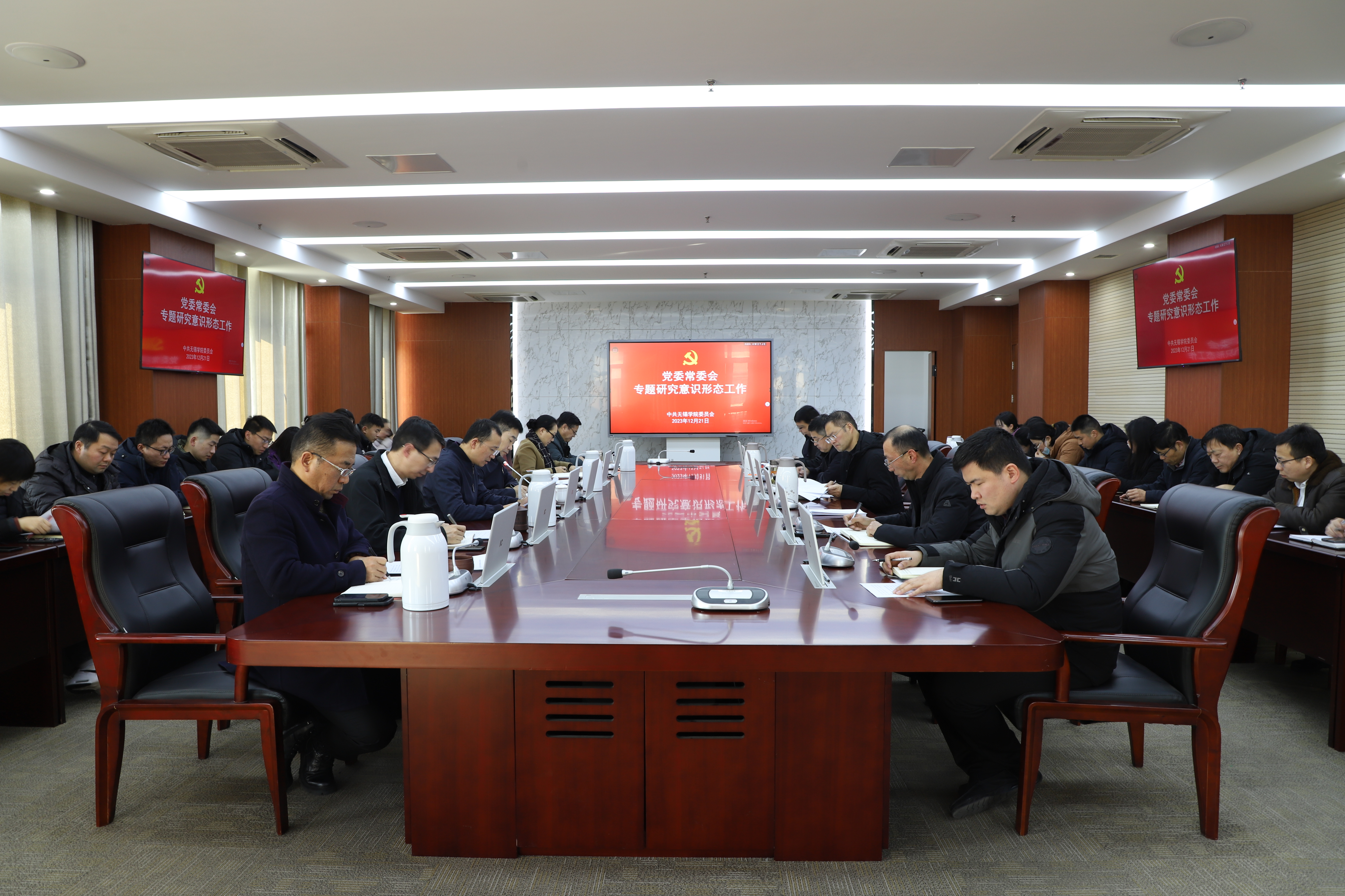 12月21日下午,校党委常委会召开会议,专题分析研判意识形态领域有关情况,对进一步加强和改进意识形态工作作出安排部署。校意识形态工作领导小组成员参会,校党委书记、意识形态工作领导小组组长杨建新主持会议并讲话。